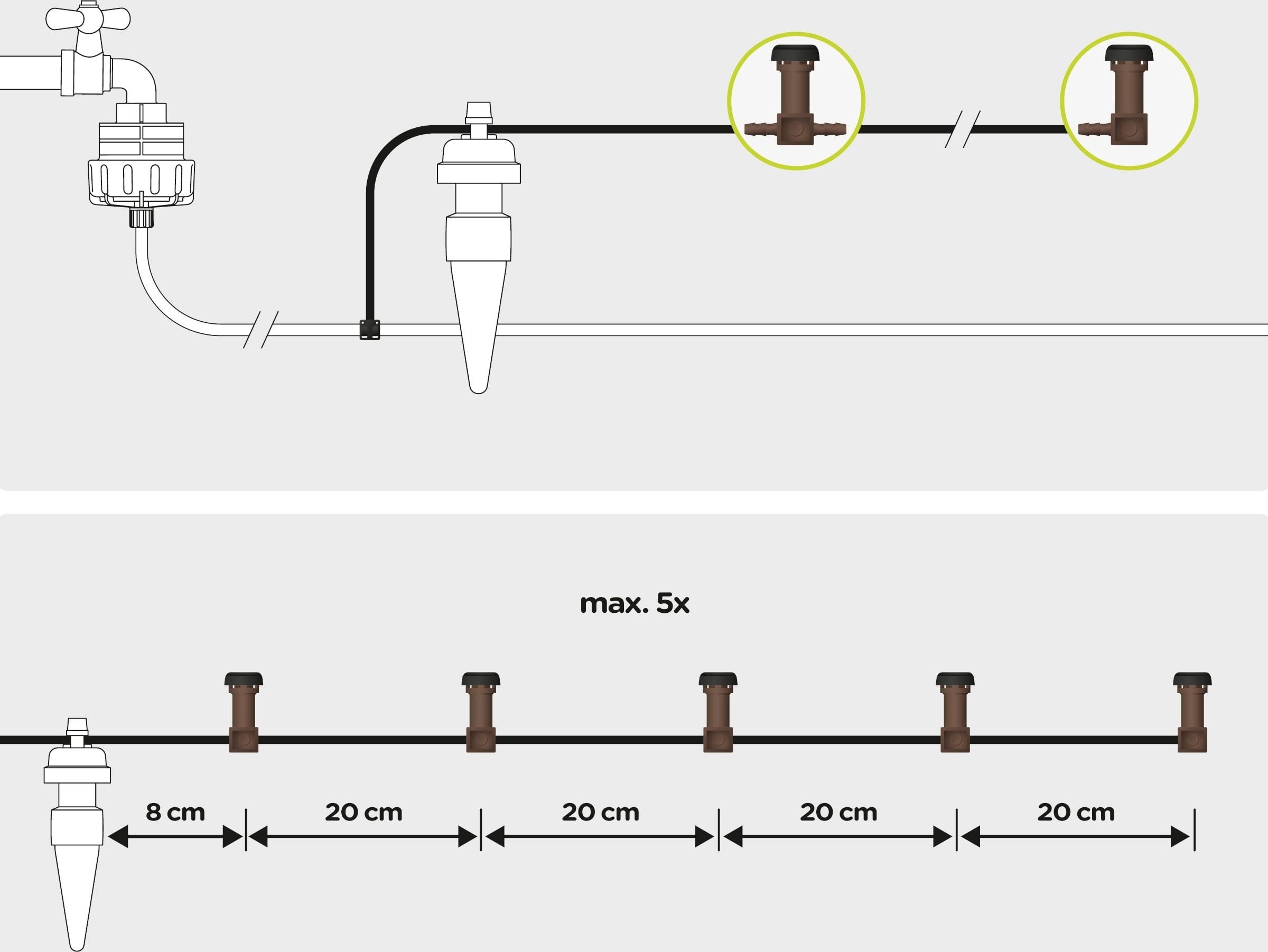 - Ca. 20 cm lange Schlauchstücke können mit maximal 5 Verteiltropfer verbunden werden.