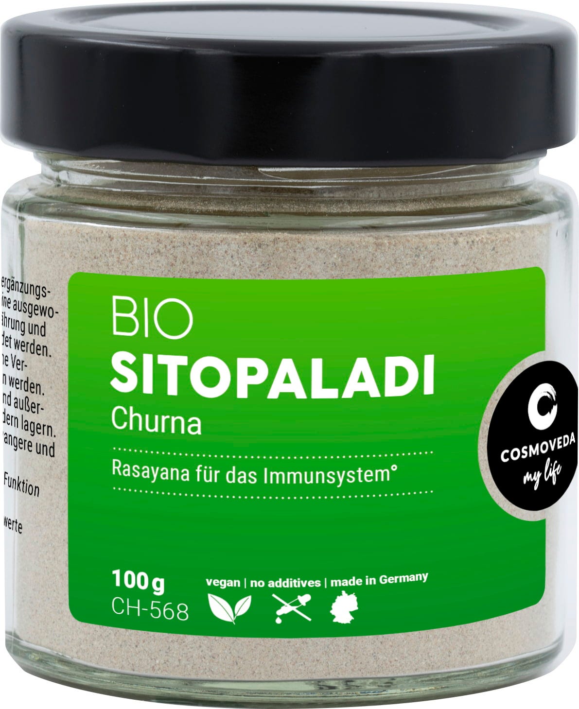 BIO Sitopaladi Churna von Cosmoveda beinhaltet eine ayurvedische Kräutermischung aus Pippali, Kardamom, Zimt, Vamsalochana und Rohrohrzucker in Bio Qualität.