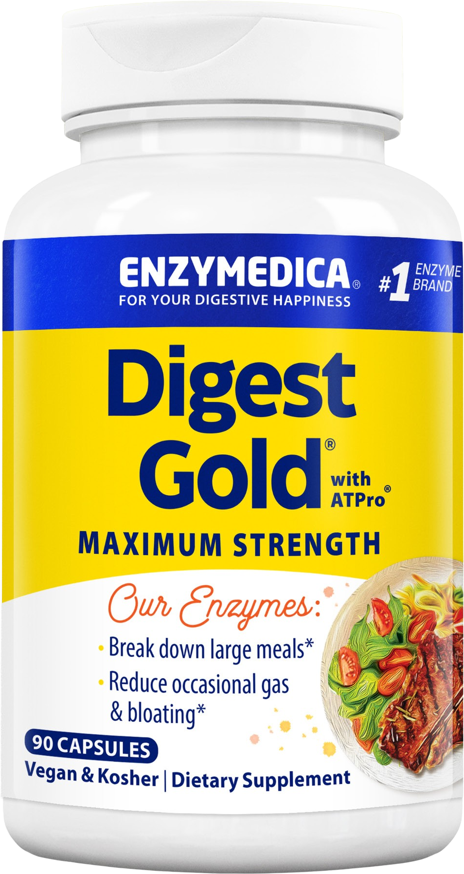 Digest Gold® with ATPro® enthält eine spezielle Mischung aus verschiedenen Enzymen, die auf die Aufspaltung der Hauptnährstoffe abgestimmt sind. Die enthaltene Thera-blend® Formel stellt sicher, dass die Enzyme in unterschiedlichen pH-Bereichen des Körpers aktiv bleiben können. Zudem liefert die Rezeptur ATPro® sowie Enzyme für Ballaststoffe und Lactose. Die Kapseln sind so konzipiert, dass sie als Ergänzung zu den Mahlzeiten eingenommen werden können. Das Produkt ist koscher und wird ohne den Einsatz von Gentechnik hergestellt."