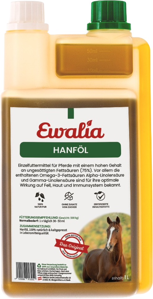Das Ewalia Hanföl bietet eine breite Palette an Einsatzmöglichkeiten.Das kaltgepresste Öl enthält keine nennenswerten Mengen an THC. Es ist 100% rein, besitzt keine Zusätze, jedoch einen hohen Gehalt an mehrfach ungesättigten Fettsäuren (75%). Außerdem verfügt Hanföl über essenzielle Aminosäuren, Vitamine, Antioxidantien, Mineralien, Enzyme und sekundäre Pflanzenstoffe.