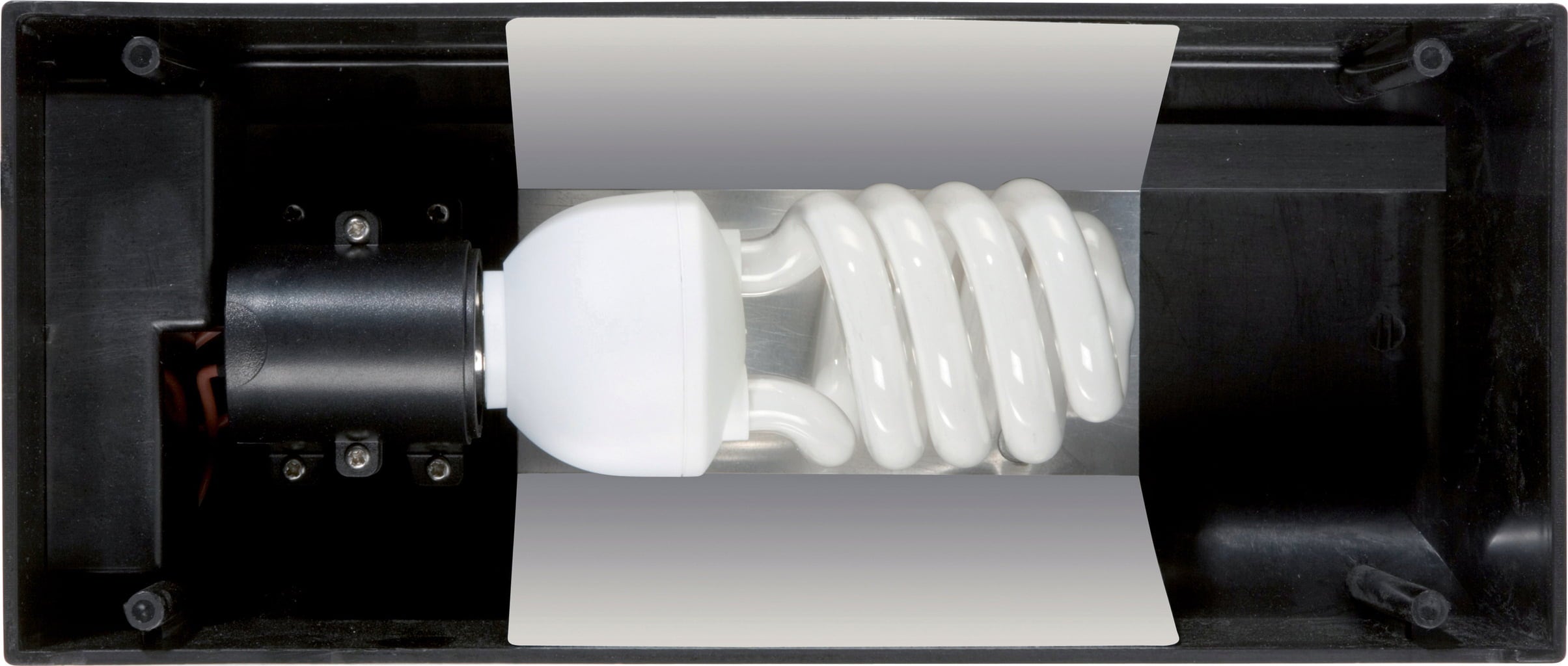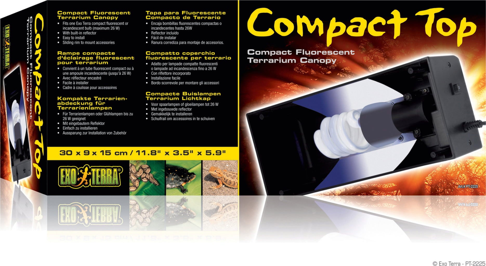 Die praktische Exo Terra Compact Terrarienlampen-Abdeckung ist optimal an die Maße der Exo Terra Glasterrarien angepasst, sie kann aber auch bei anderen Terrarien gleicher Größen zur Anwendung kommen. Im Inneren der hochwertigen Abdeckung befindet sich neben der Lampenfassung ein Reflektor, der das ausgestrahlte Licht vollkommen ausschöpft und für beste Lichtverhältnisse sorgt.