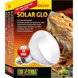 Exo Terra Solar Glo 80 W ist eine Vollspektrum-Quecksilberdampflampe, die das natürliche Sonnenlicht in einem Terrarium ersetzt. Die Lampe ist optimal an die Licht- und Wärmebedürfnisse der Terrarientiere angepasst und versorgt sie mit dem ultravioletten (UVA, UVB), dem sichtbaren und dem infraroten Licht.