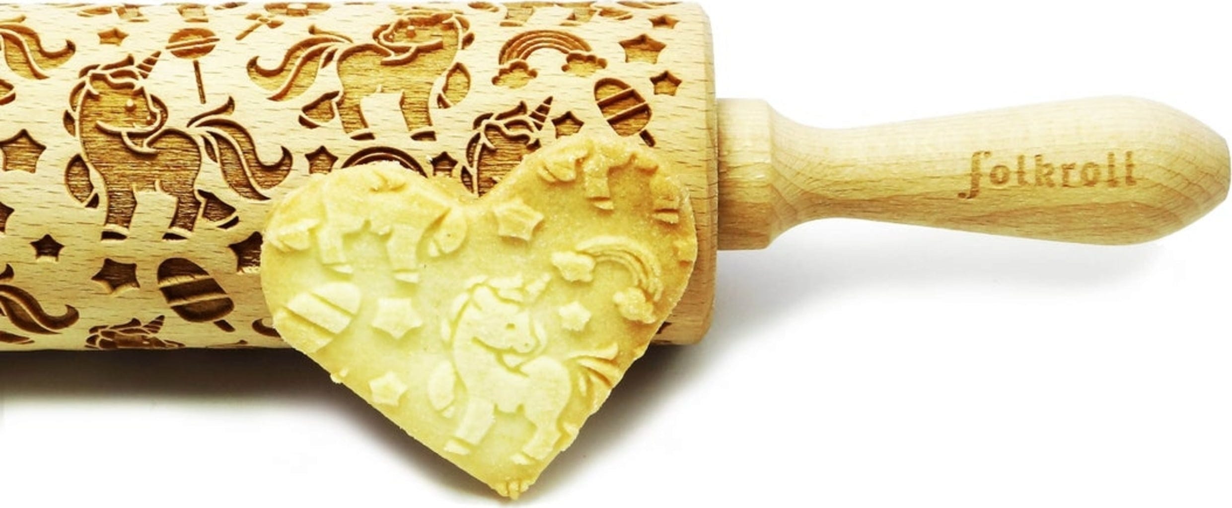 Einhornfans & Prinzessinnen aufgepasst! Mit dieser aufwendig gravierten Teigrolle aus hochwertigem Buchenholz zaubern kleine und große Bäckerinnen im Handumdrehen entzückende Einhorn-Kekse. So einfach war das Backen von dekorativ verzierten Plätzchen nämlich noch nie: Über den ausgerollten Teig rollen und anschließend nach Herzenslust mit Teigrädchen und Ausstechern in Form bringen, backen, fertig!