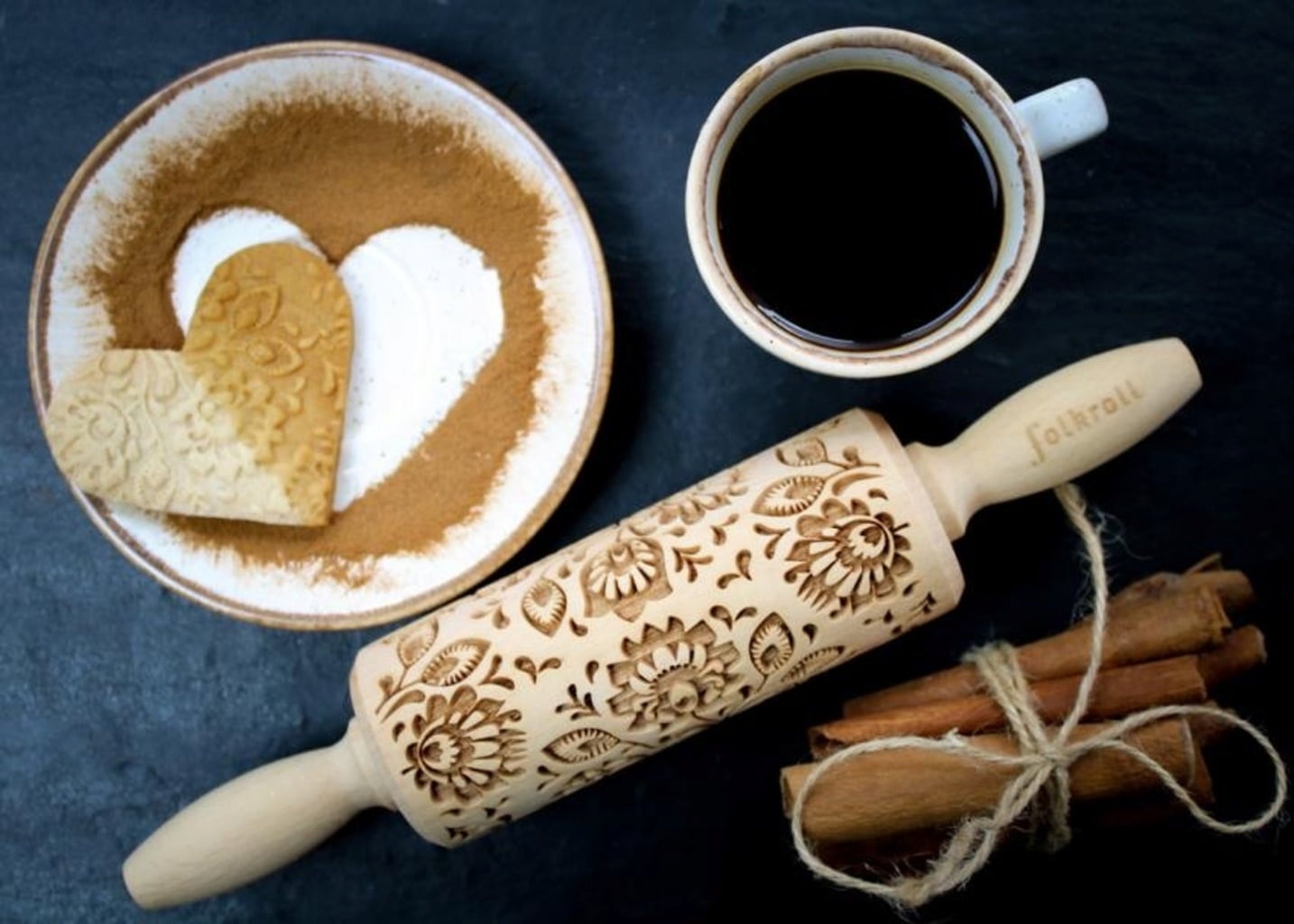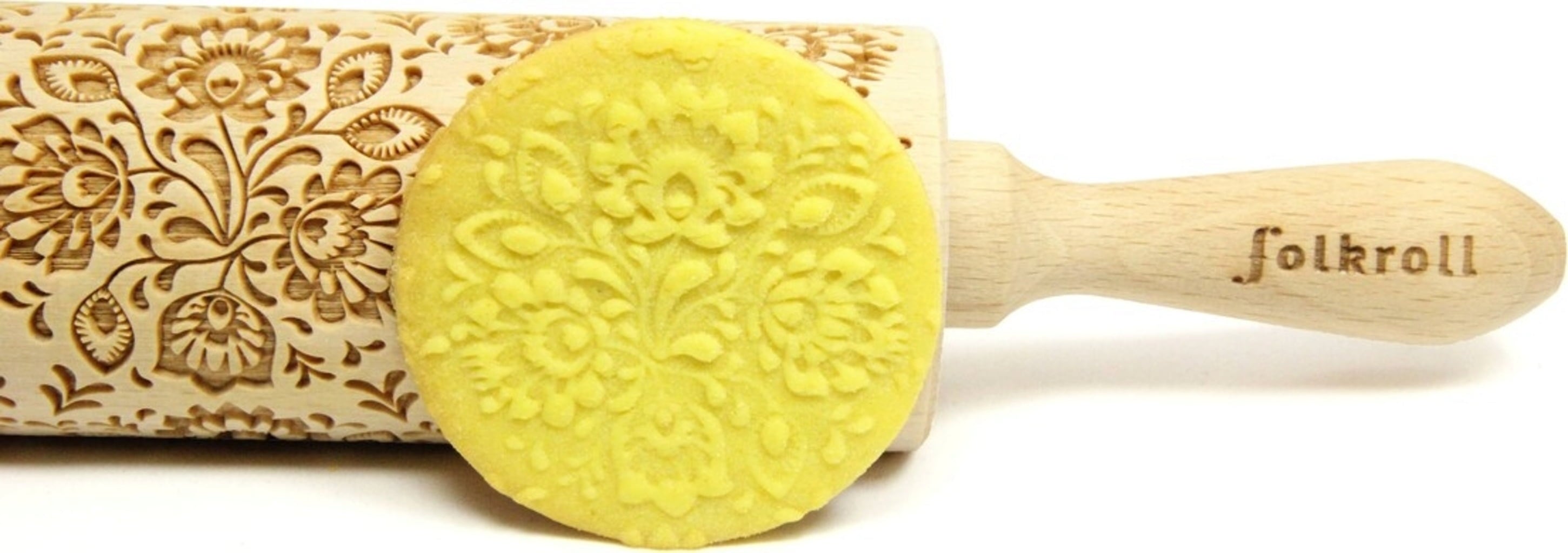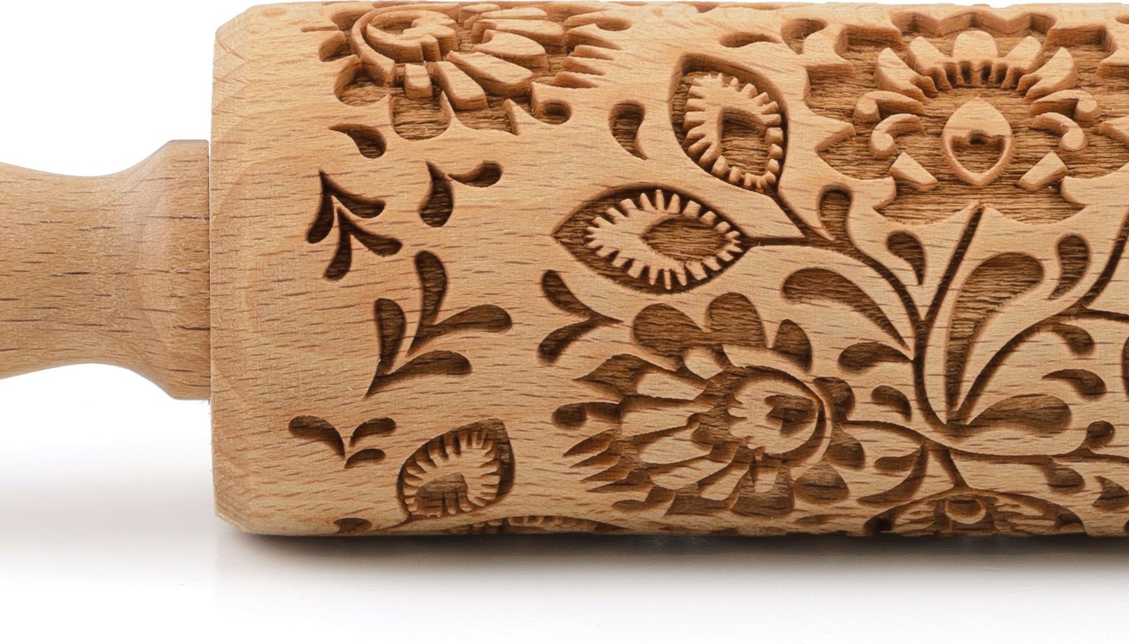 Dieses zauberhaft gravierte Nudelholz mit folkloristischem Blumenmuster sorgt im Handumdrehen für wunderschön verzierte Kekse und Plätzchen, von denen man nicht genug bekommen kann. Die Anwendung ist denkbar einfach: Über den ausgerollten Teig rollen und anschließend nach Herzenslust mit Teigrädchen bzw. Ausstechern ausschneiden bzw. ausstechen, backen, fertig!