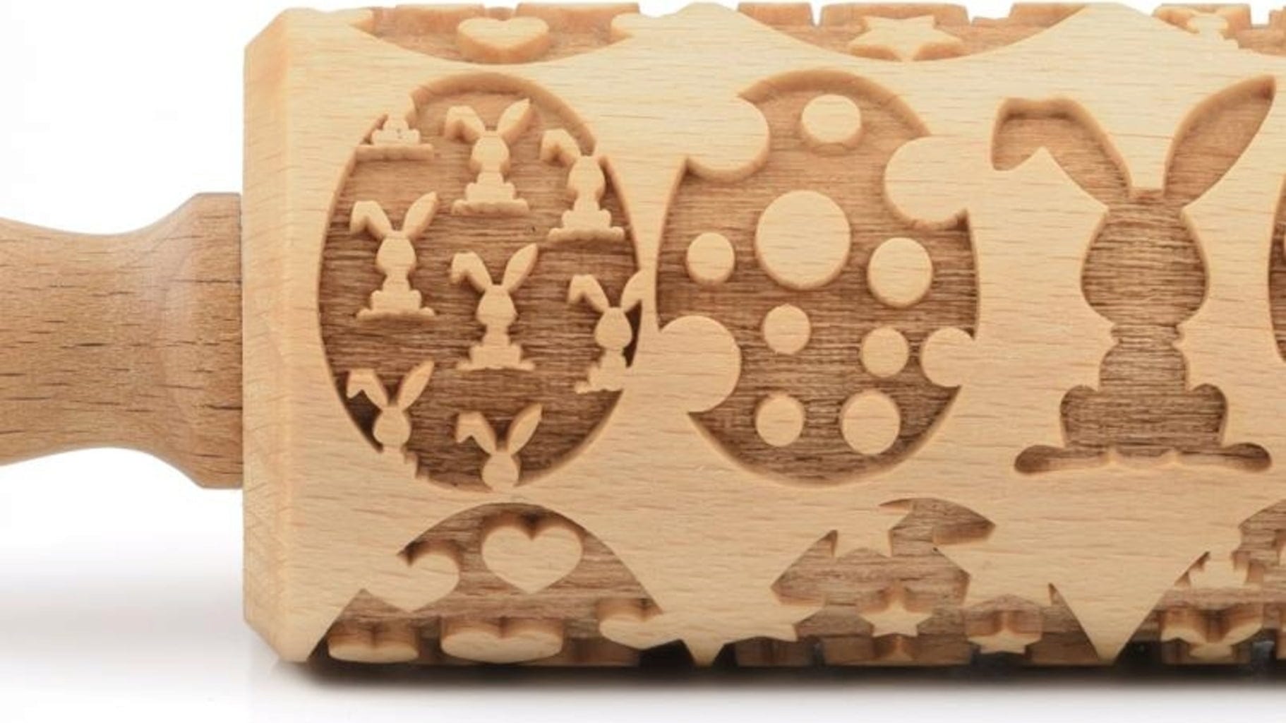 Entzückende Häschen und zahlreiche Ostereier zieren diese aufwendig gravierte Motivteigrolle aus hochwertigem Buchenholz. Perfekt für kleine Köstlichkeiten zu Ostern, denn so einfach war das Backen von dekorativ verzierten Plätzchen noch nie: Über den ausgerollten Teig rollen und anschließend nach Herzenslust mit Teigrädchen und Ausstechern in Form bringen, backen, fertig!