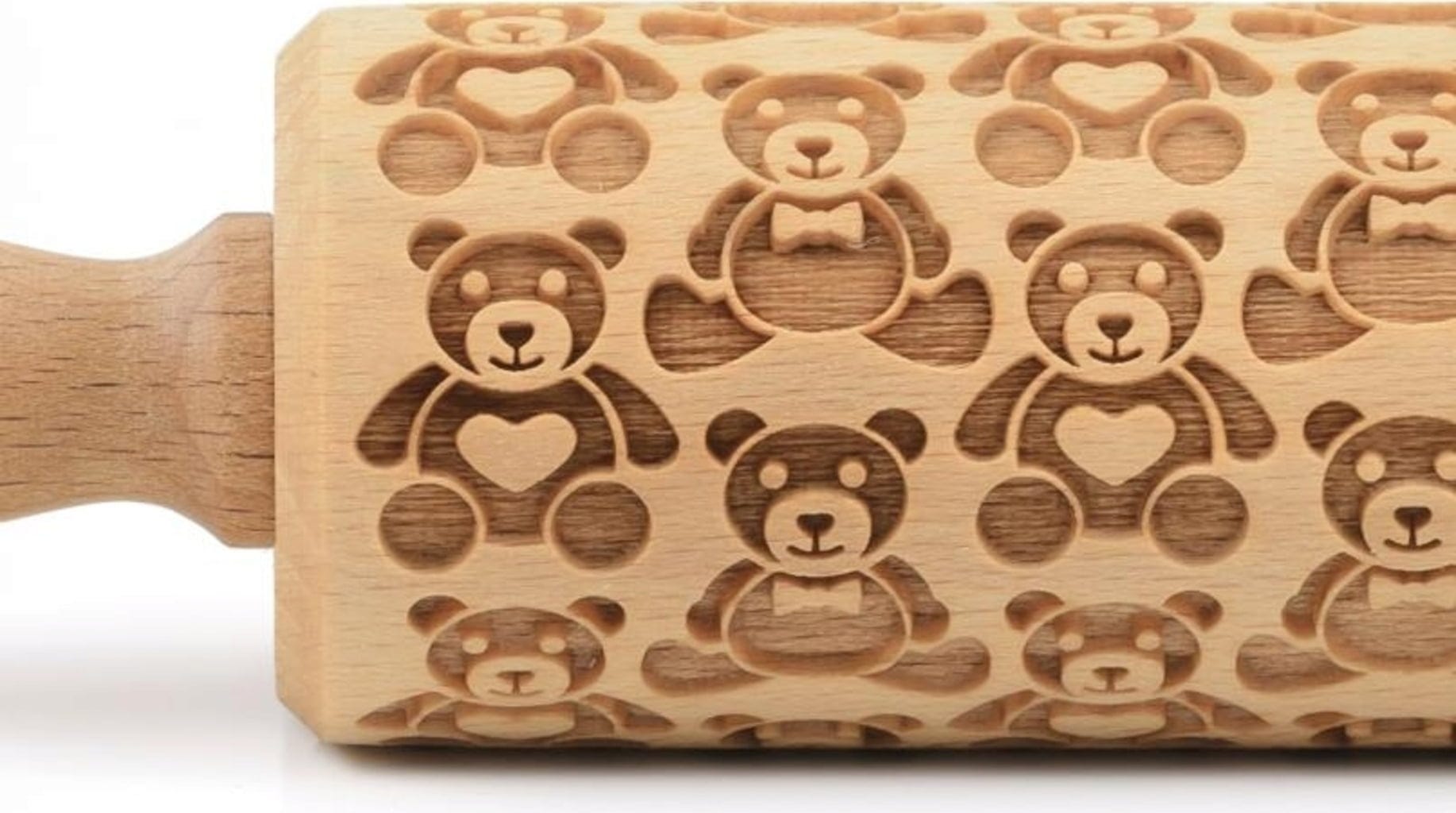 Unzählige süße Teddybären zieren diese aufwendig gravierte Motivteigrolle aus hochwertigem Buchenholz. Perfekt für kleine Naschkatzen, denn so einfach war das Backen von dekorativ verzierten Plätzchen noch nie: Über den ausgerollten Teig rollen und anschließend nach Herzenslust mit Teigrädchen und Ausstechern in Form bringen, backen, fertig!