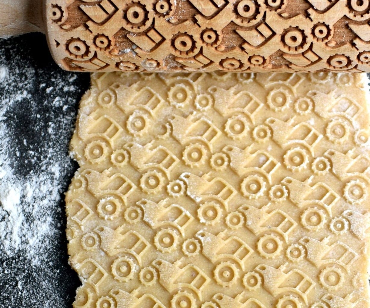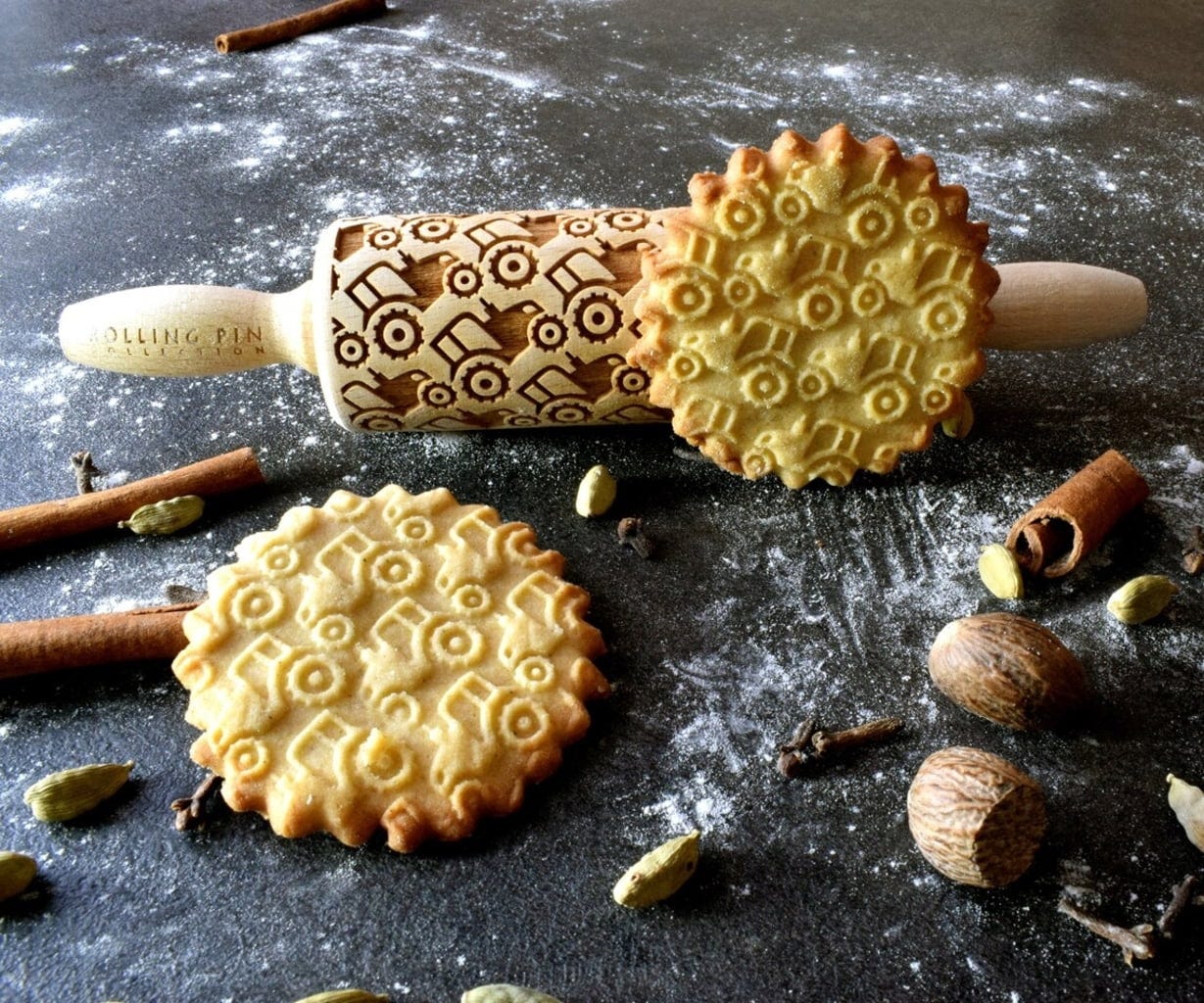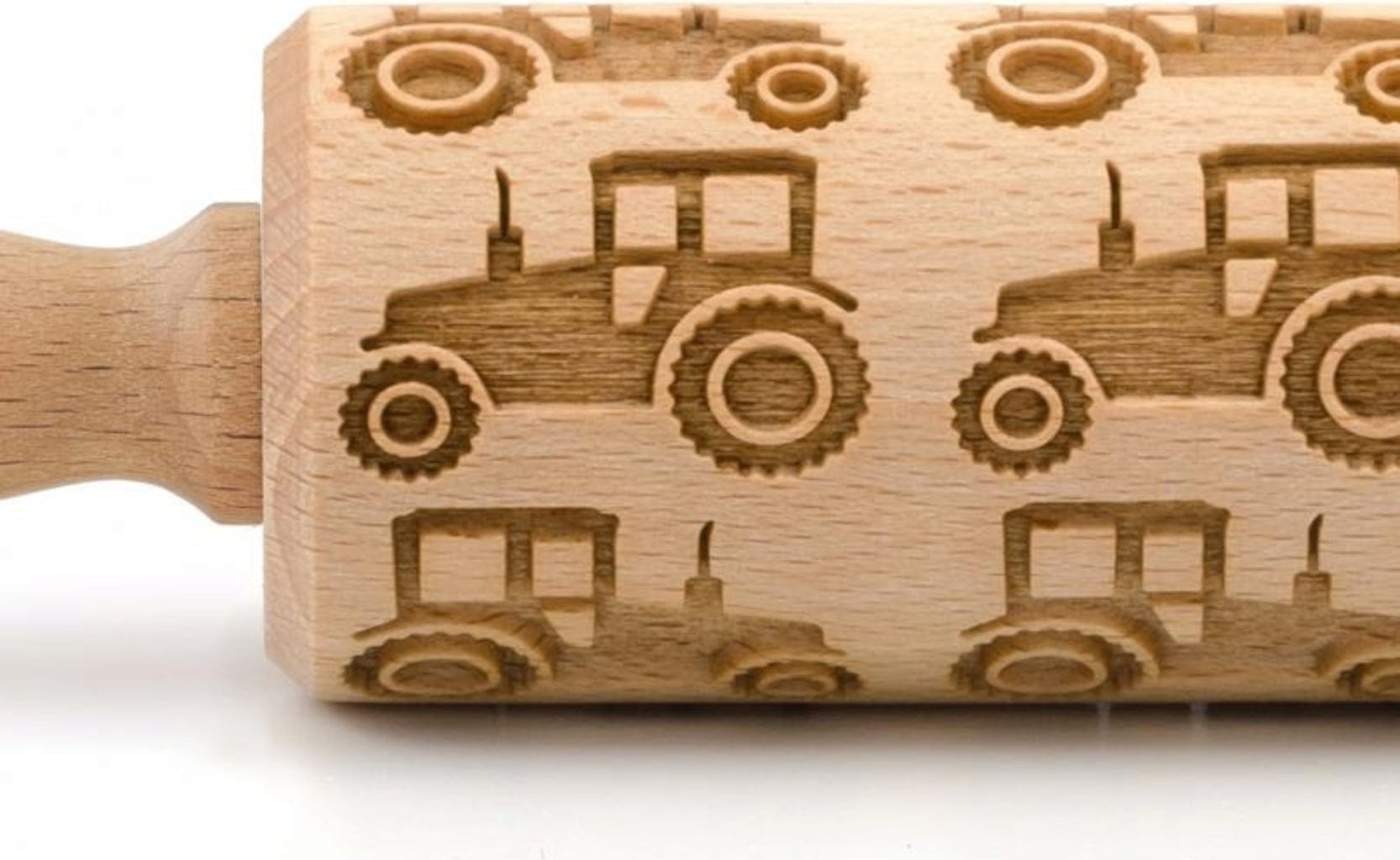 Traktorfans aufgepasst! Mit dieser aufwendig gravierten Teigrolle aus hochwertigem Buchenholz zaubern kleine Bäcker im Handumdrehen coole Traktorkekse. So einfach war das Backen von dekorativ verzierten Plätzchen nämlich noch nie: Über den ausgerollten Teig rollen und anschließend nach Herzenslust mit Teigrädchen und Ausstechern in Form bringen, backen, fertig!