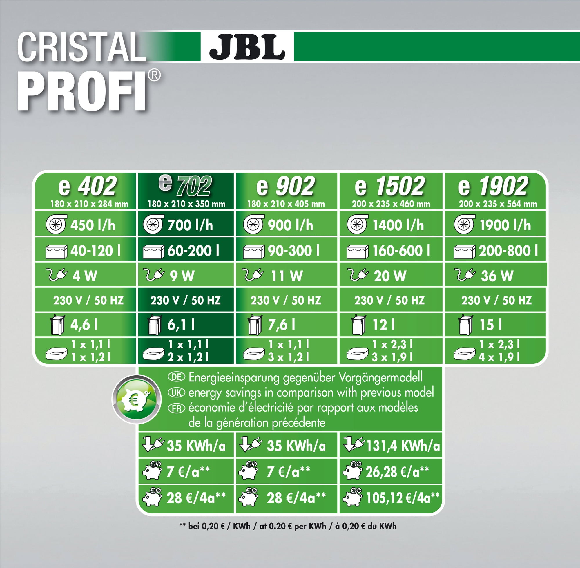 Mit nur geringen Stromverbrauch bietet der CristalProfi eine hohe Energieersparnis. Bei gleichbleibender effektiver Wasserumwälzung verbraucht das Gerät 31% weniger Strom als vergleichbare Vorgängermodelle. Der patentierte Schlauchanschlussblock mit Sicherheitsventil verhindert den Austritt von Wasser beim Abkoppeln des Filters. JBL CristalProfi ist TÜV geprüft.