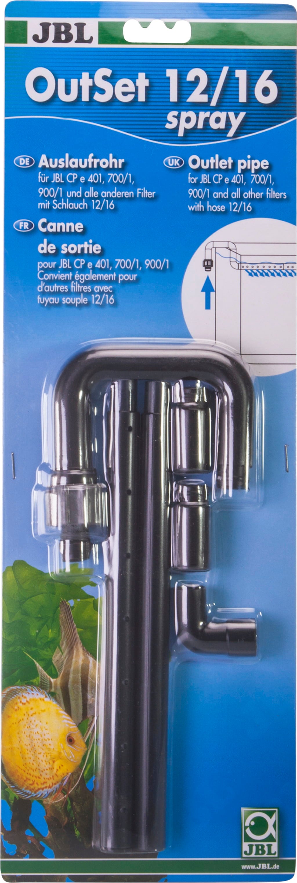 Das Auslaufset wird am Schlauch des Außenfilters (nicht im Lieferumfang enthalten) angeschlossen, das Breitstrahlrohr wird im Aquarium platziert. Die ideale Wasserrückführung hebt den Sauerstoffgehalt dank des Düsenstrahlrohres an. Die Installation ist praktisch durch das eckige Winkelrohr- Winkel: 59mm. Das Düsenstrahlrohr ist justierbar, die Führung kann über Eck erfolgen. Die Befestigung ist dank der Schlauchverschraubungen sehr sicher. Die Installation des JBL OutSet wide kann auch in bepflanzten Aquarien durchgeführt werden.