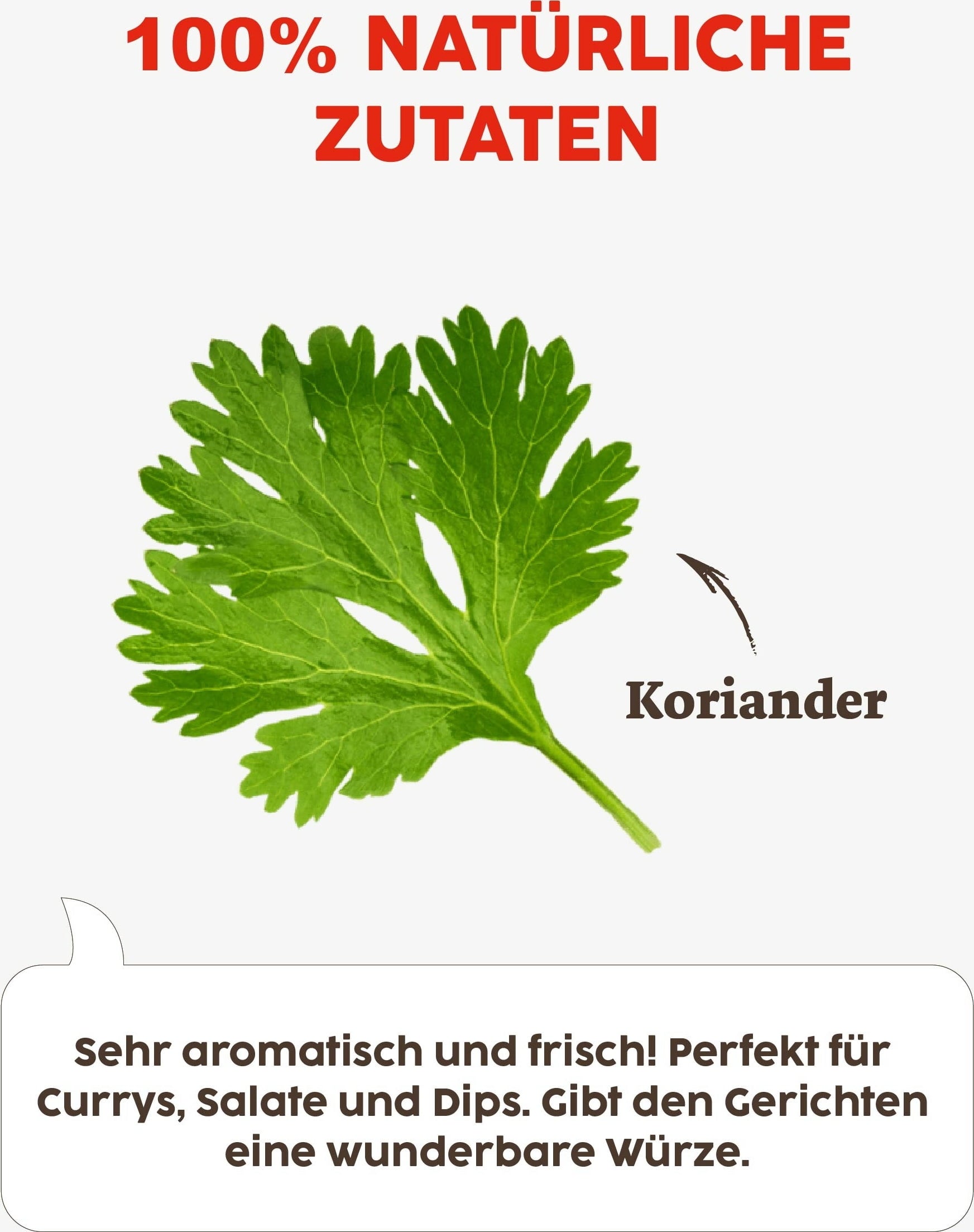 Die Korianderblätter sind auf der ganzen Welt als edles Gewürz bekannt. Zudem verfügen die Blätter des Korianders über einen zitrusartig-frischen, etwas moschusartigen Geschmack. Durch den vielseitigen Geschack, können die Blätter für Backwaren, Saucen, Würsten, Fleisch-, Gemüse- und Linsengerichte verwendet werden.