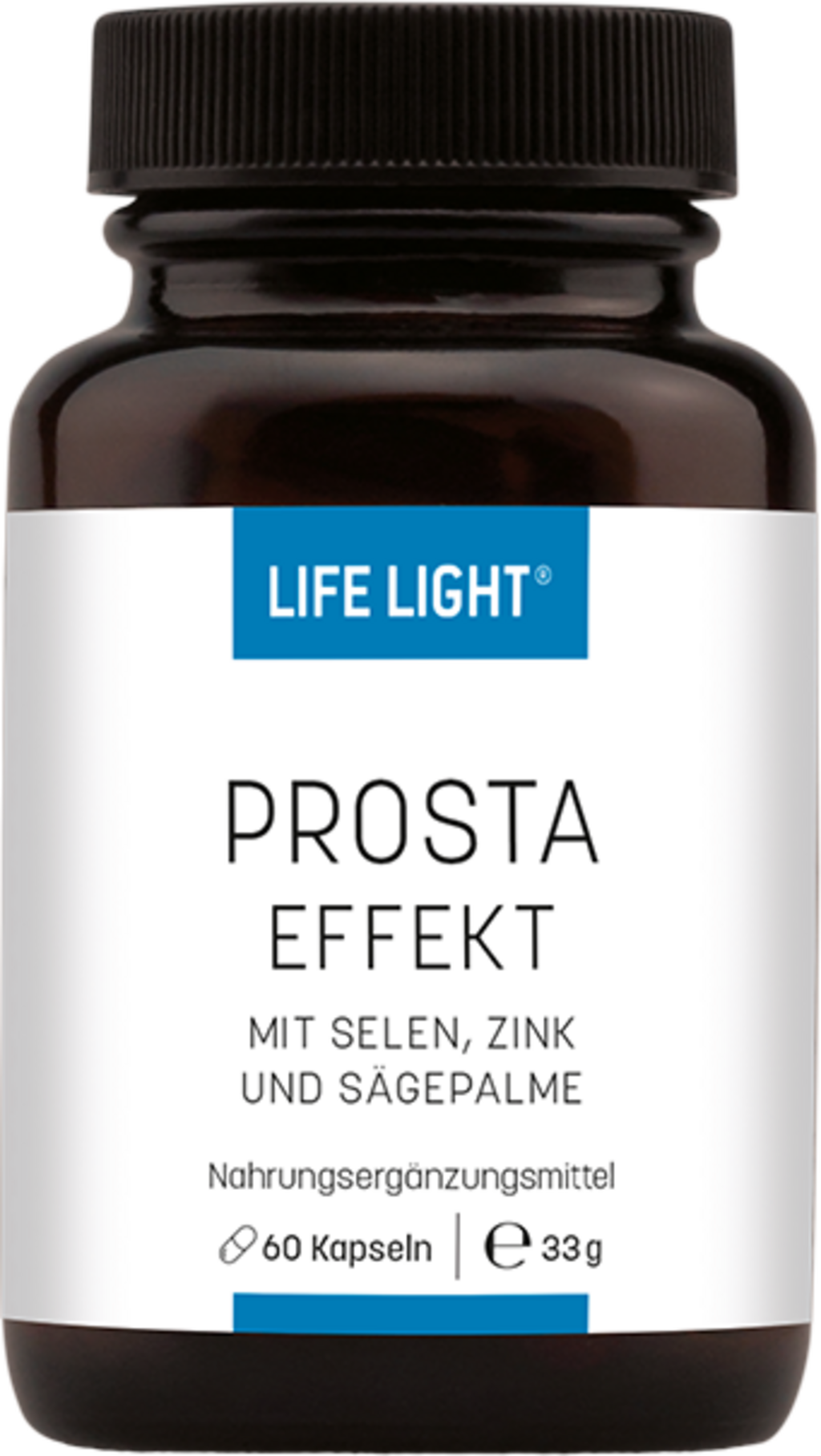 Life Light® Prosta Effekt kombiniert ausgewählte Pflanzenextrakte und Mikronährstoffe in einer praktischen Kapsel. Enthalten sind Kürbiskern- und Sabalpalmenfrucht-Extrakt, mexikanisches Yams, Zink, Selen und Vitamin E.