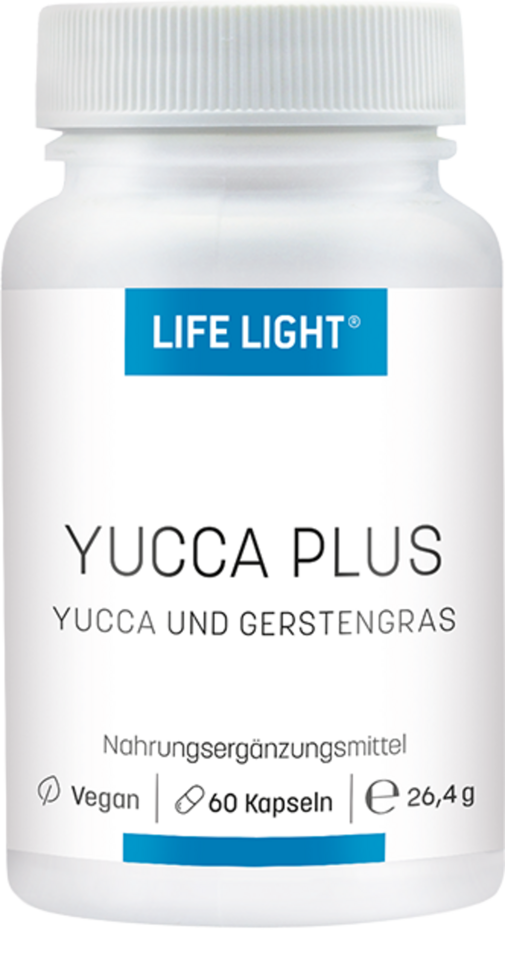 Yucca plus von LIFE LIGHT® vereint die Yucca-Pflanze (Yucca schidigera) mit Gerstengraspulver in einer hochwertigen Kapsel. Die Kombination enthält natürliche Saponine, Polyphenole, Vitamine, Mineralstoffe und Bioflavonoide. Die Rezeptur verzichtet auf künstliche Zusatzstoffe und ist für Vegetarier und Veganer geeignet.
