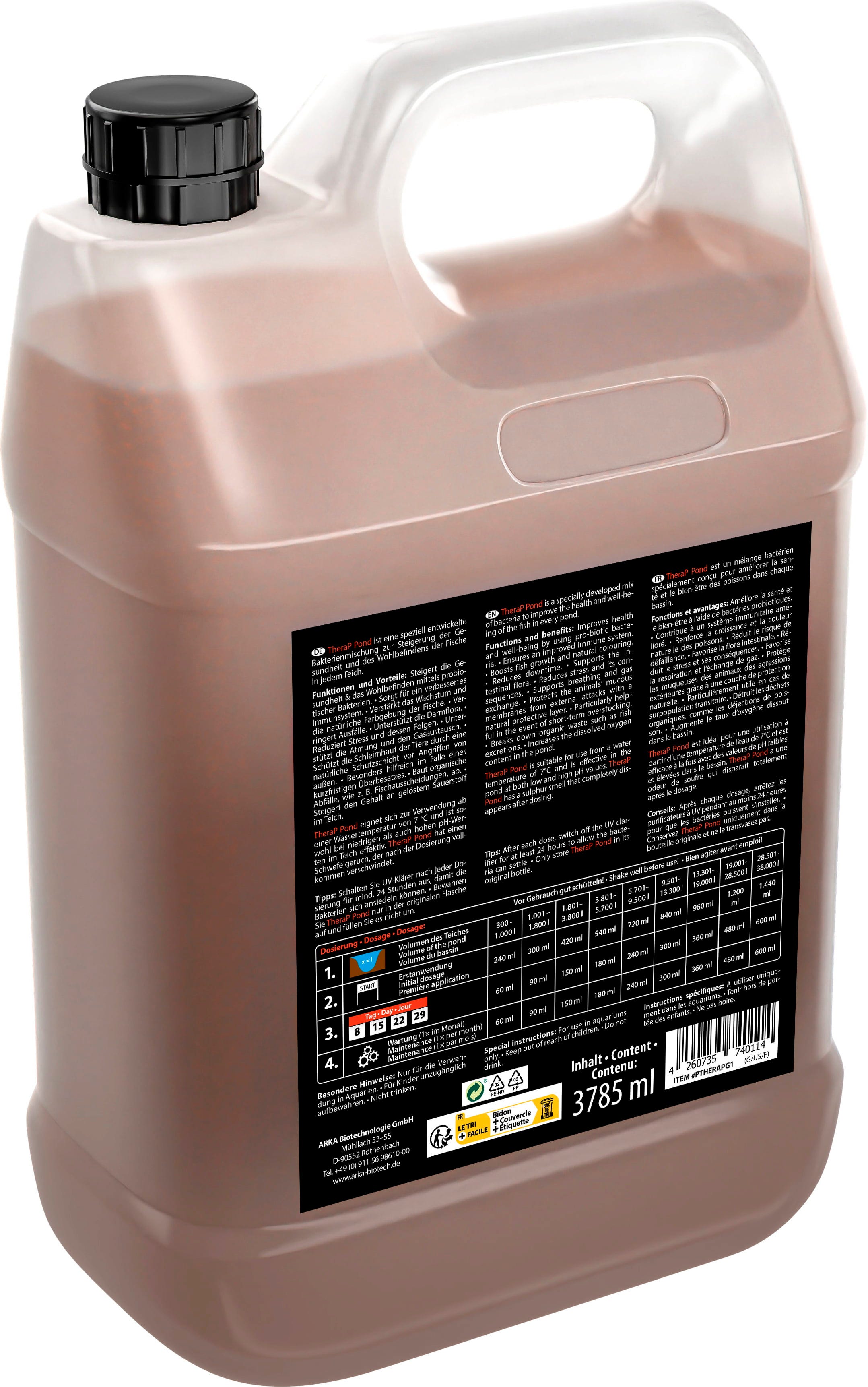 Wellness für Teichfische: TheraP Pond von ARKA unterstützt dank speziell entwickelter, probiotischer Bakterien das Wohlbefinden der Tiere. Die lebenden Organismen bauen organische Abfälle bzw. Ausscheidungen ab und steigern den Gehalt an gelösten Stoffen sowie Sauerstoff im Wasser. Die Folge sind zahlreiche Benefits für Fische:
