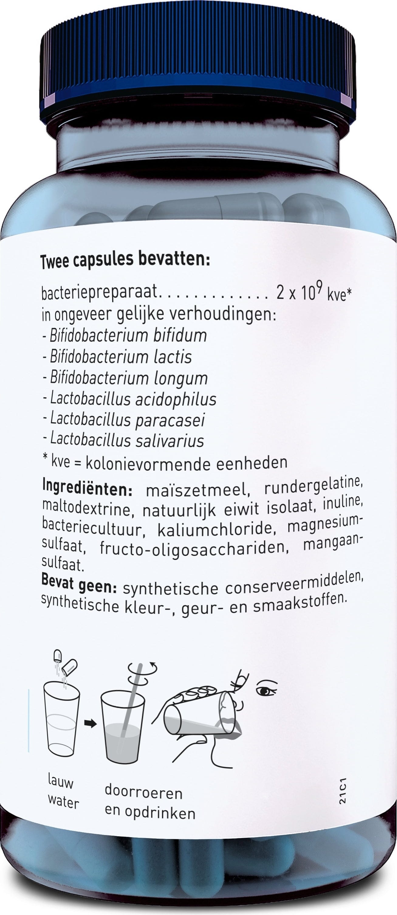 Maisstärke, Kapselhülle (Rindergelatine), Maltodextrin, natürliches Eiweißisolat, Inulin, Fructo-Oligosaccharide, Mangansulfat, Kaliumchlorid, Magnesiumsulfat, Probiotischer Komplex