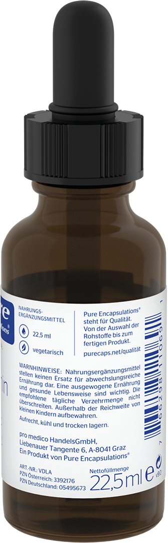 Vitamin D3 liquid von Pure Encapsulations® liefert hochdosierte Tropfen in geprüfter Qualität. Das Vitamin D3 ist in neutralem Öl gelöst und frei von Gluten, Laktose, Soja sowie unnötigen Zusatzstoffen. Die praktische Pipette ermöglicht eine einfache und präzise Dosierung. Jeder Tropfen liefert 1000 I.E. Vitamin D3 und kann direkt eingenommen oder in Smoothies, Joghurt oder andere Lebensmittel eingerührt werden.