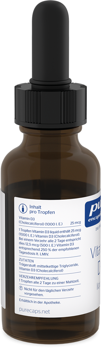 - 1 Tropfen Vitamin D3 liquid enthält 25 mcg (1000 I.E.) Vitamin D3 (Cholecalciferol).