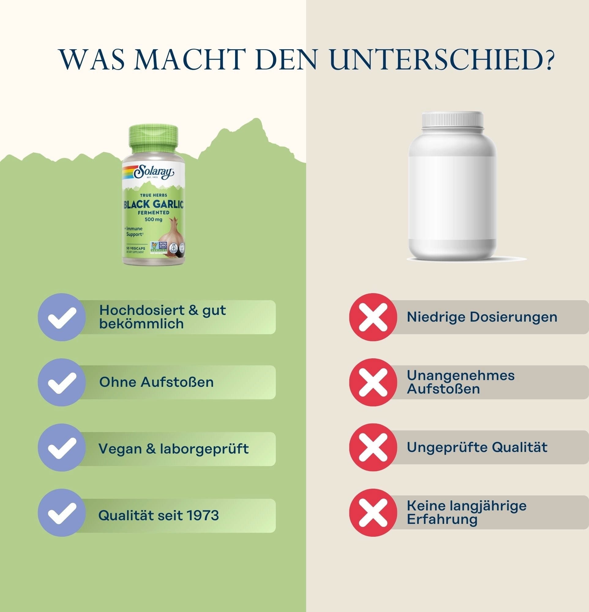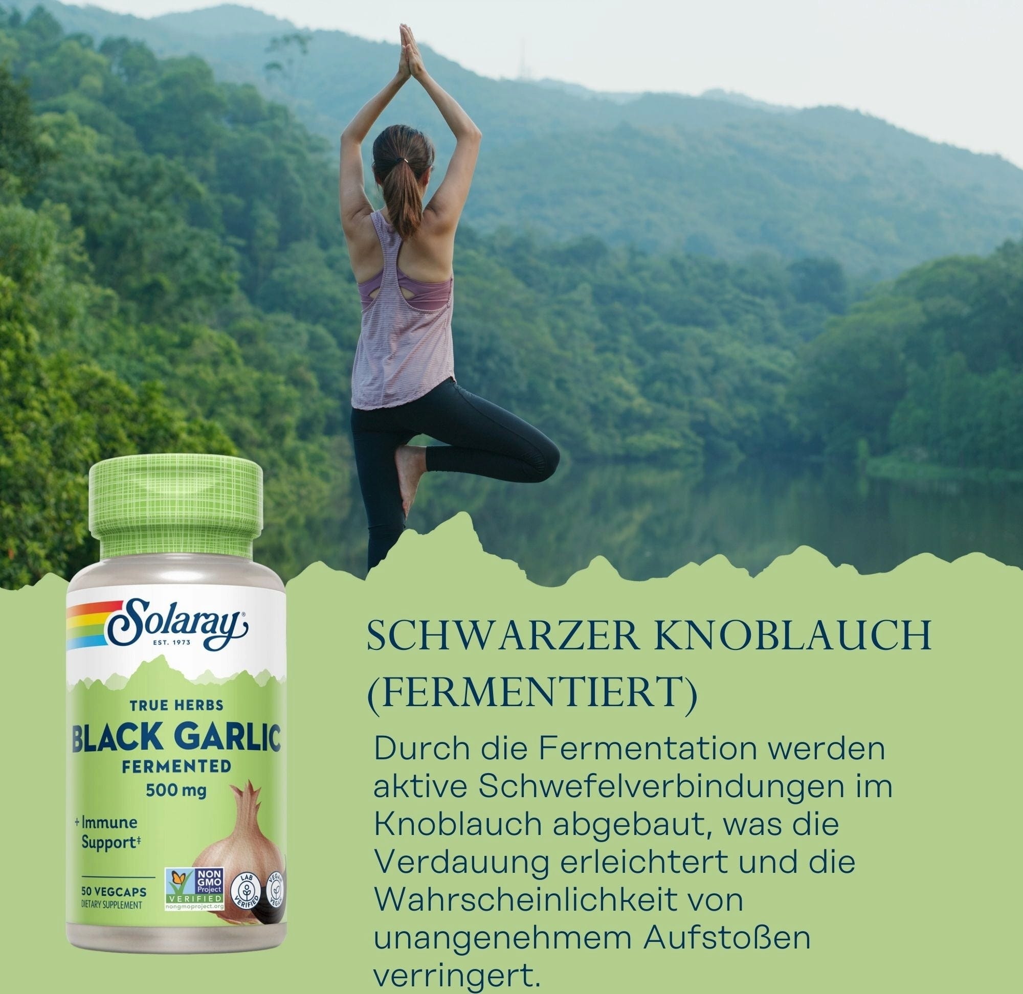 Als Schwarzen Knoblauch bezeichnet man den bereits gereiften Knoblauch. Dieser wird über mehrere Wochen mithilfe von Hitze und Feuchtigkeit zum Alten gebracht. Hierbei brechen die Enzyme, die für die Schärfe im Knoblauch verantwortlich sind, zusammen. Übrig bleiben die typisch schwarzen Nelken. In Asien und den USA wird der Knoblauch überaus gerne, wegen seines sirupartigen, süßen Geschmacks welcher vergleichbar ist mit Tamarinde oder Balsamico, in gehobenen Küchen verwendet. Solaray setzt obendrein auch noch auf Fermentation, dies macht das Endprodukt um ein vielfaches Haltbarer.