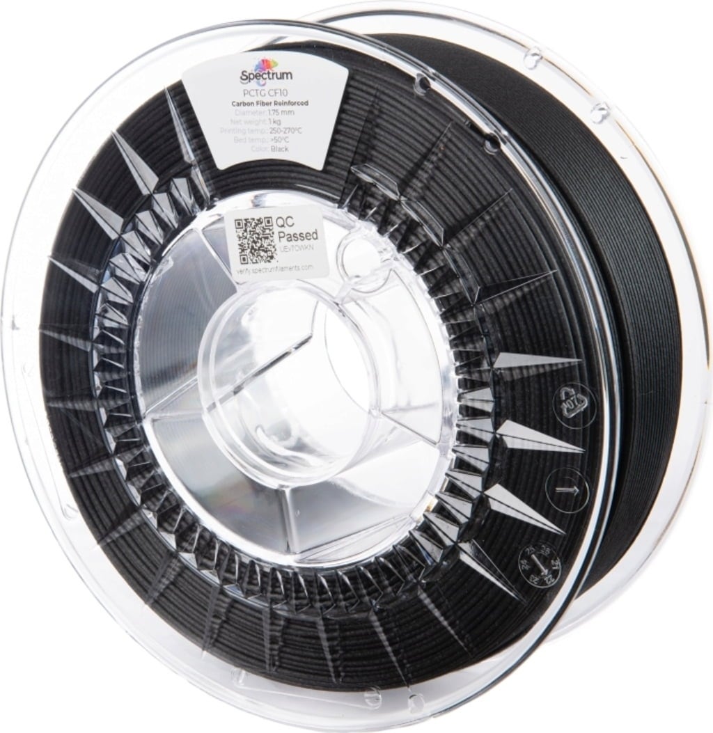 PCTG CF10 von Spectrum ist ein Verbundwerkstoff, der auf PCTG basiert und mit einem 10%igen Anteil an Kohlenstofffasern angereichert ist. Dank Kohlenstofffasern zeigt das Material eine hohe Temperaturbeständigkeit mit einer Wärmeformbeständigkeitstemperatur von 78 °C, wodurch einer Schrumpfung entgegengewirkt wird. Zudem verleihen die Kohlenstofffasern den gedruckten Teilen und Komponenten ein mattes Carbon-Finish.