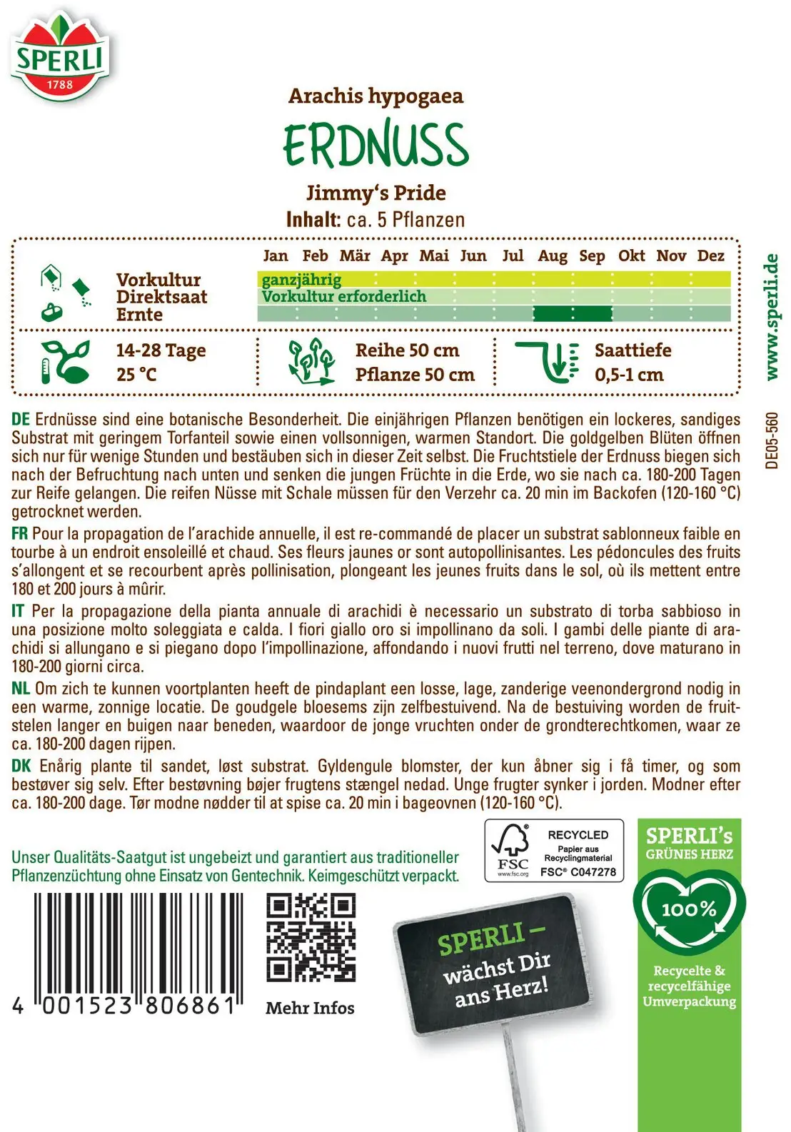 Erdnüsse sind eine botanische Besonderheit. Nachdem die gelben Blüten befruchtet wurden, bohrt sich die junge Frucht in den Boden und entwickeln sich dort. Die Blüten sind goldgelb, öffnen sich nur für wenige Stunden und bestäuben sich in dieser Zeit selbst. Die Erdnüsse können nach einer Kulturzeit von etwa 180 bis 200 Tagen geerntet werden.