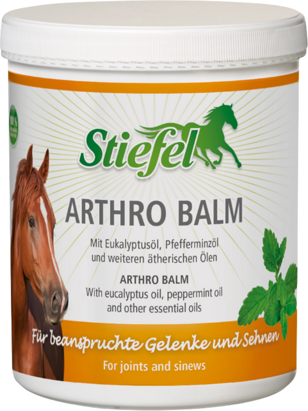 Stiefel Arthro Balm ist eine Pflegesalbe zum Einmassieren mit Eukalyptus, Pfefferminzöl und Rosmarin. Durch die belebenden Inhaltsstoffe kann Stiefel Arthro Balm wohltuend auf beanspruchte und leicht schmerzhafte Sehnen, Gelenke und Muskeln wirken. Die natürlichen Inhaltsstoffe kühlen und erfrischen die behandelten Strukturen und können die Durchblutung fördern. Rosmarin wird zudem eine lindernde Wirkung bei Schmerzen nachgesagt. Äußerlich angewendet ist Stiefel Arthro Balm nicht dopingrelevant.