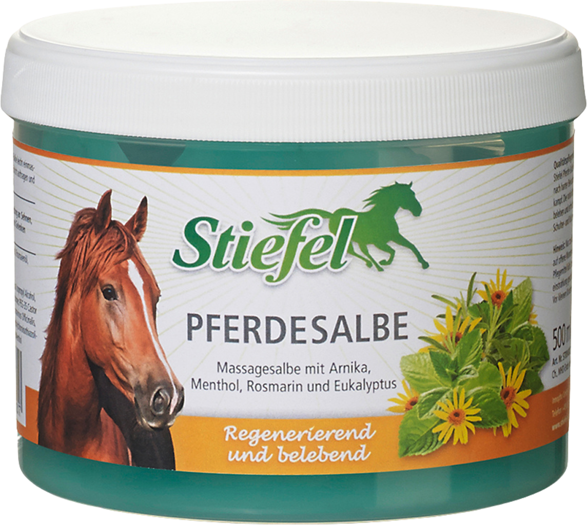 Stiefel Pferdesalbe ist eine Massagesalbe mit Arnika, Menthol, Rosmarin und Eukalyptus, die nach anstrengendem Training oder Wettkampf wohltuend auf beanspruchte Sehnen und Gelenke wirken kann. Die natürlichen Inhaltsstoffe kühlen, beleben und erfrischen und sind auch für den Einsatz im Schulter- und Rückenbereich geeignet. Rosmarin und Arnika wird zudem eine lindernde Wirkung bei Schmerzen nachgesagt. Äußerlich angewendet ist Arnika nicht doping-relevant. Für einen optimalen Effekt sollte Stiefel Pferdesalbe leicht einmassiert werden, bevor eine dickere Schicht aufgetragen wird, die unbedeckt einziehen sollte.