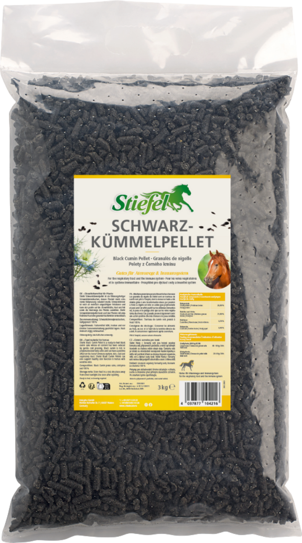Stiefel Schwarzkümmelpellet ist ein fütterungsfertiger Schwarzkümmelkuchen, dessen Ölanteil durch schonende Kaltpressung reduziert wurde. Schwarzkümmel ist reich an mehrfach ungesättigten Fettsäuren und kann sich positiv auf die Abwehrkräfte, Haut und Fell sowie die Atemwege des Pferdes auswirken. Stiefel Schwarzkümmelpellet kann auch bei Pferden mit empfindlicher Haut eine gesunde Hautfunktion unterstützen.