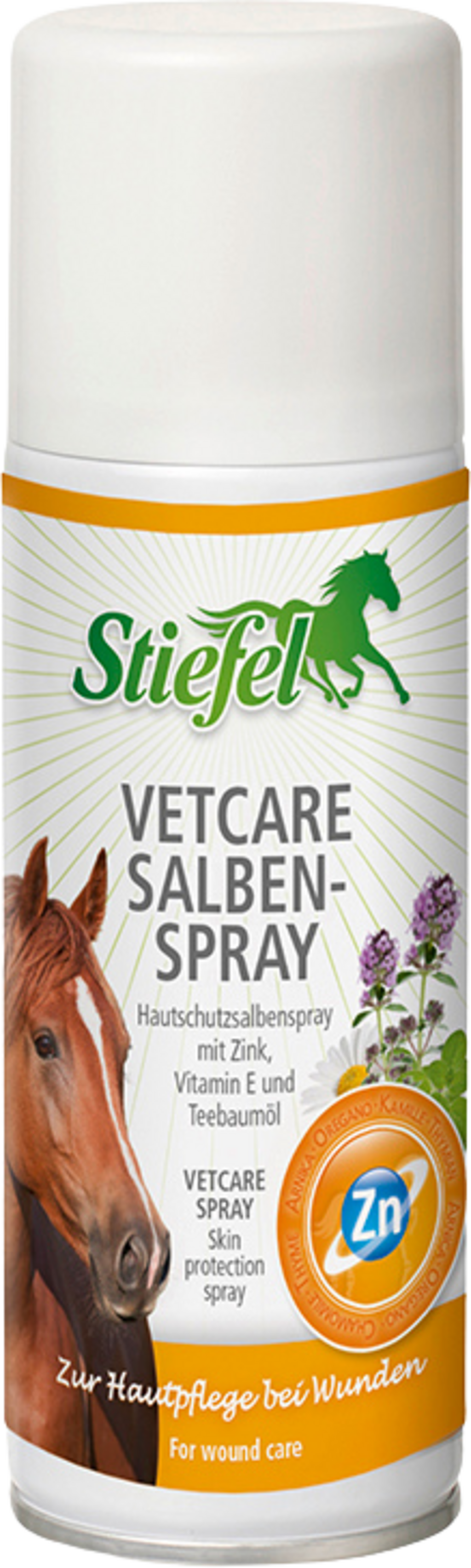 Stiefel Vetcare Salbenspray ist eine Hautpflege-Sprühsalbe für die erste Wundversorgung. Die ausgewählten pflanzlichen Inhaltsstoffe (Arnika, Oregano, Thymian, Kamille und Teebaumöl) in Verbindung mit Zink und Vitamin E können zu einer verbesserten Wundheilung beitragen. Stiefel Vetcare Salbenspray kann verletzte Haut beruhigen und pflegen. Das Hautschutzsalbenspray kann zudem entzündungshemmend und unterstützend bei der Behandlung von Mauke und Scheuerstellen wirken. Spannungsgefühle, Juckreiz und Scheuerneigung können gelindert werden.