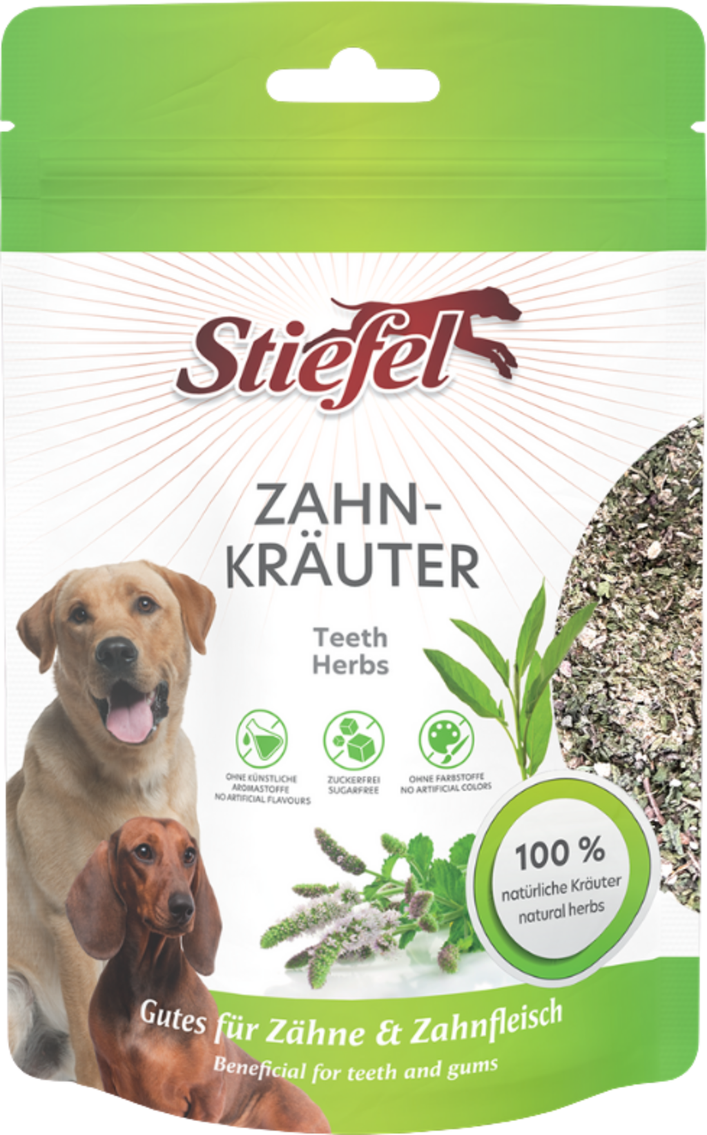 Stiefel Zahnkräuter können bei der Aufnahme mit der täglichen Futterration zur Reinigung und Pflege von Zähnen und Zahnfleisch deines Hundes auf natürliche Art beitragen. Eine gesunde Zahnpflege kann sich auf den gesamten Organismus positiv auswirken.