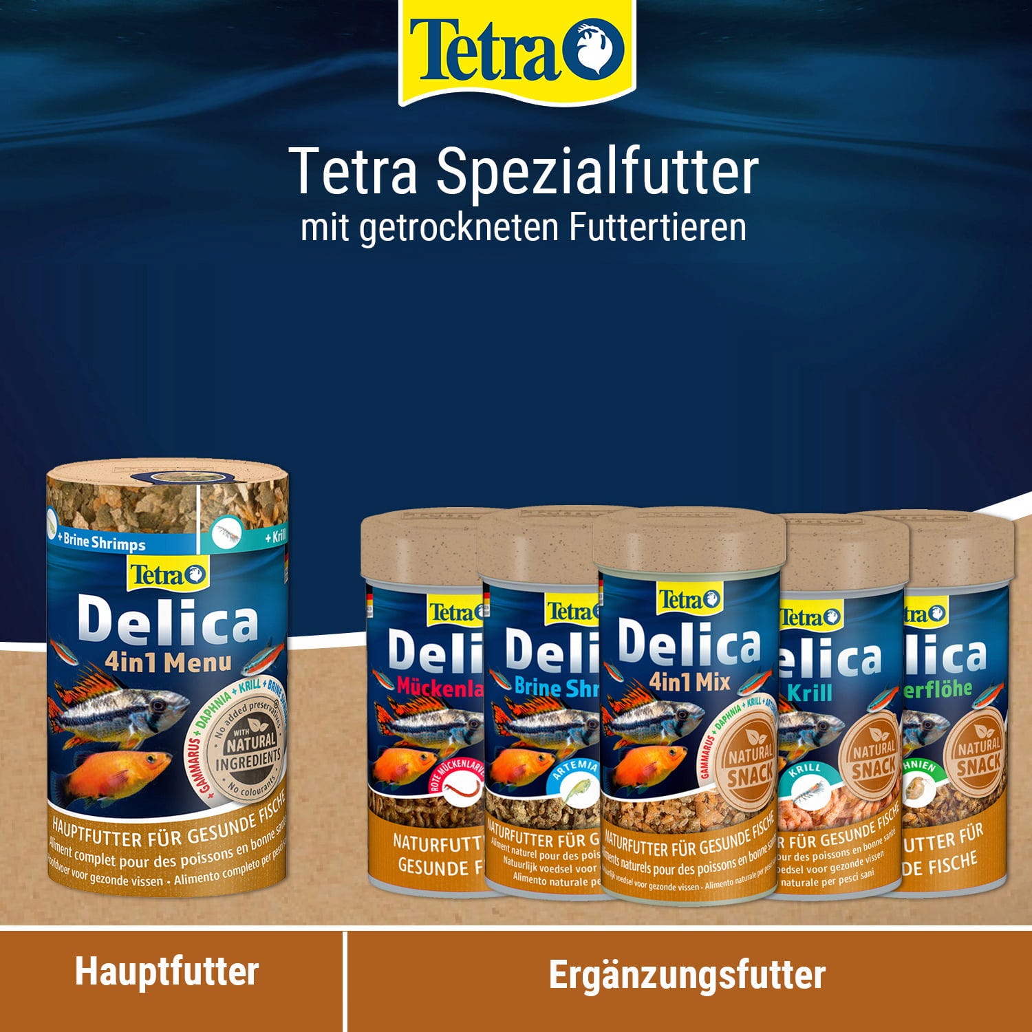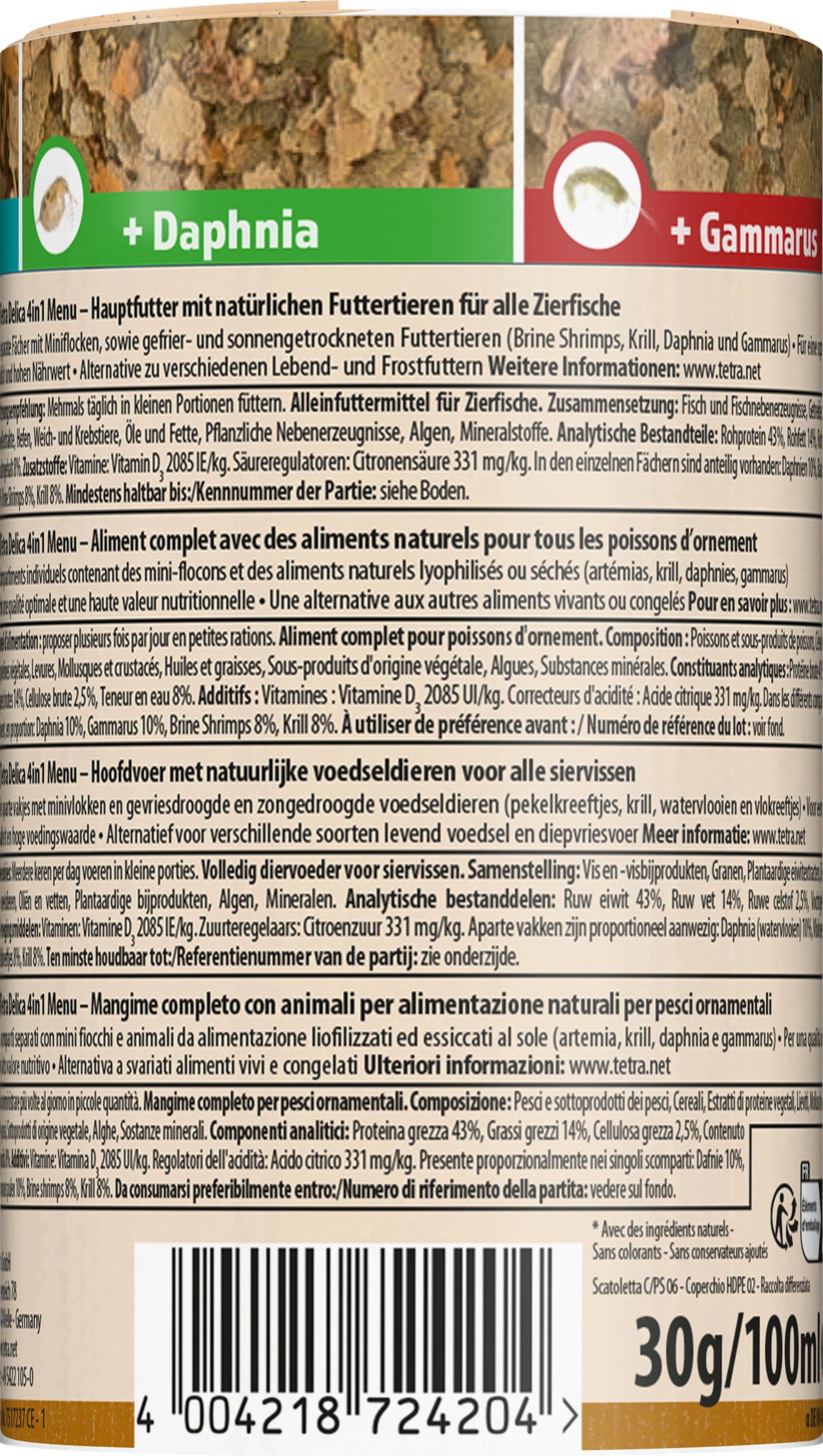 Das TetraDelica Mix ist eine Flockenfuttermischung mit Gammarus, Salinenkrebsen, Daphnien und Mückelarven angereichert. Getrennt in 4 verschiedenen Kammern.