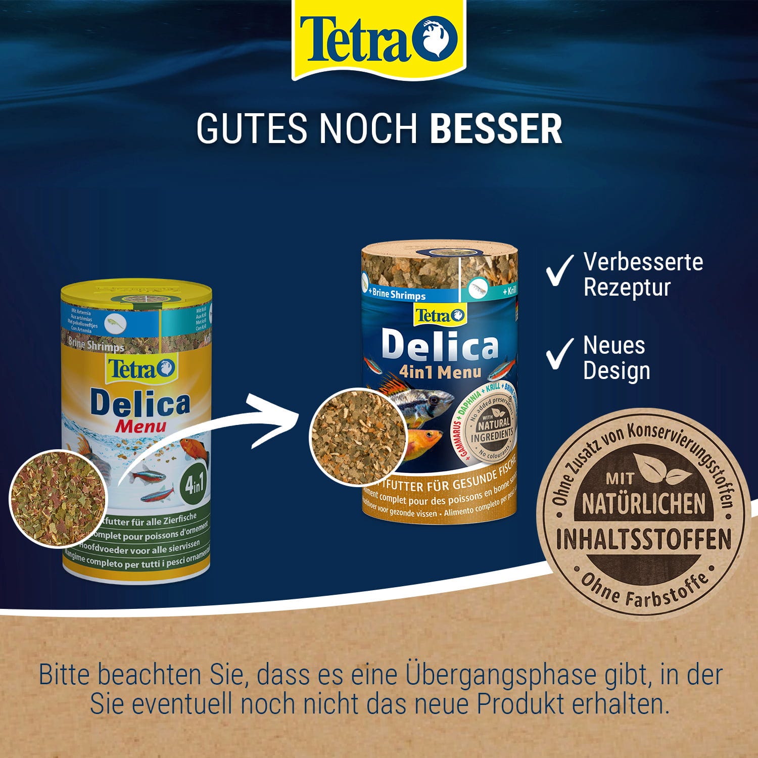 Tetra Delica Menu ist ein Hauptfutter, das mehrmals täglich in solchen Portionen, wie die Fische in wenigen Minuten verzehren können, gefüttert werden kann. Das Mindesthaltbarkeitsdatum auf der Verpackung zeigt den Zeitpunkt an, bis zu dem das Futter verschlossen und fachgerecht gelagert unverdorben bleibt. Um Abwechslung auf den Speiseplan der gepflegten Fische zu bringen ist das regelmäßige Verfüttern von Tetra Fresh Delica zu empfehlen.
