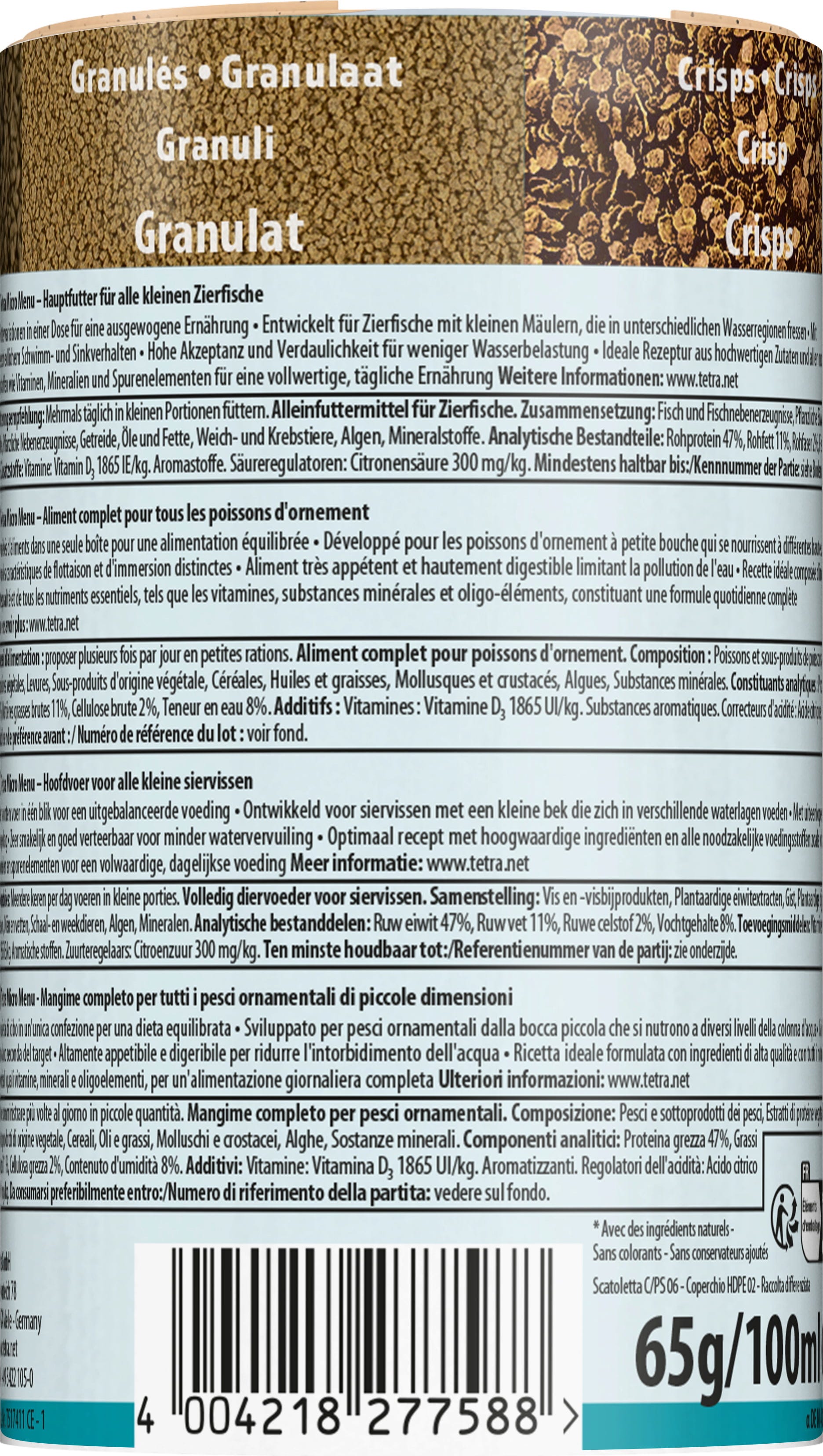 Mit dem neuen Micro-Sortiment stellt Tetra erneut seine Innovationskraft unter Beweis: dank neuartiger Produktionsverfahren beinhalten die vier neuen Sorten in kleinsten Darreichungsformen alle Nährstoffe, die kleine Fische mit kleinen Mäulern benötigen. Dabei weisen die Granules, Pellets, Sticks und Crisps unterschiedliche Schwimm- und Sinkeigenschaften auf- zur artgerechten Fütterung der Fische in den verschiedenen Wasserzonen. Bei dieser feinen Struktur und Größe ist es umso wichtiger, dass jedes Futterteilchen die richtige Menge hochwertiger Proteine, Fette, Vitamine und Mineralstoffe enthält, damit die Tiere gesund und fit bleiben. Daher haben die Tetra Experten dieses Micro Futter entwickelt. Dank des Durchmessers von 0,3 und 2,5 mm weichen die Sorten schnell durch und können von Guppy, Microrasbora und Co. schnell aufgenommen werden. Dabei enthalten sie feinst vermahlene Zutaten, etwa Carotinoide für eine leuchtende Farbenpracht, sowie pflanzliche Inhaltsstoffe für Gesundheit, Vitalität und zur Stärkung des Immunsystems. Tetra Micro Menu ist die perfekte Lösung zur Fütterung kleiner Süßwasserfische! Die praktische Dosierdose enthält einen Drehverschluss für die einfache Futterauswahl. Das Futter kann gelegentlich mit Leckerbissen, wie z. B. den Tetra FreshDelica Sorten ergänzt werden.