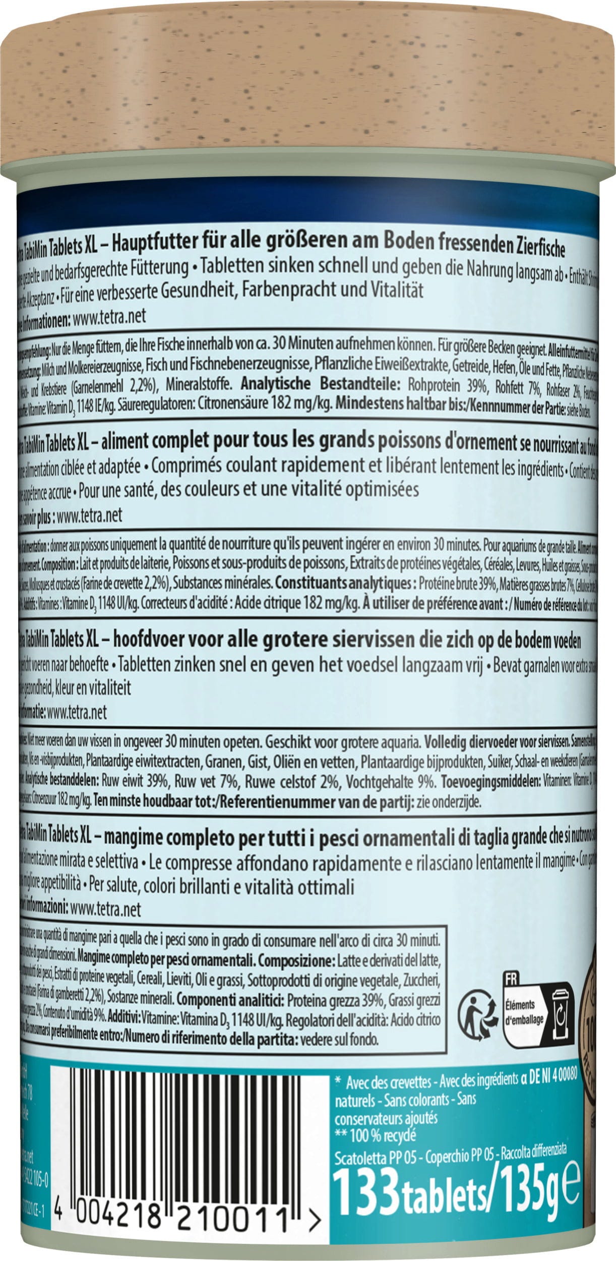 Die Tetra Tablets TabiMin XL sind Hauptfutter-Tabletten für alle tropischen Zierfische im Süßwasser-Aquarium, die sich in den unteren Wasserzonen und am Bodengrund aufhalten und ist auch in weiteren Größen erhältlich.