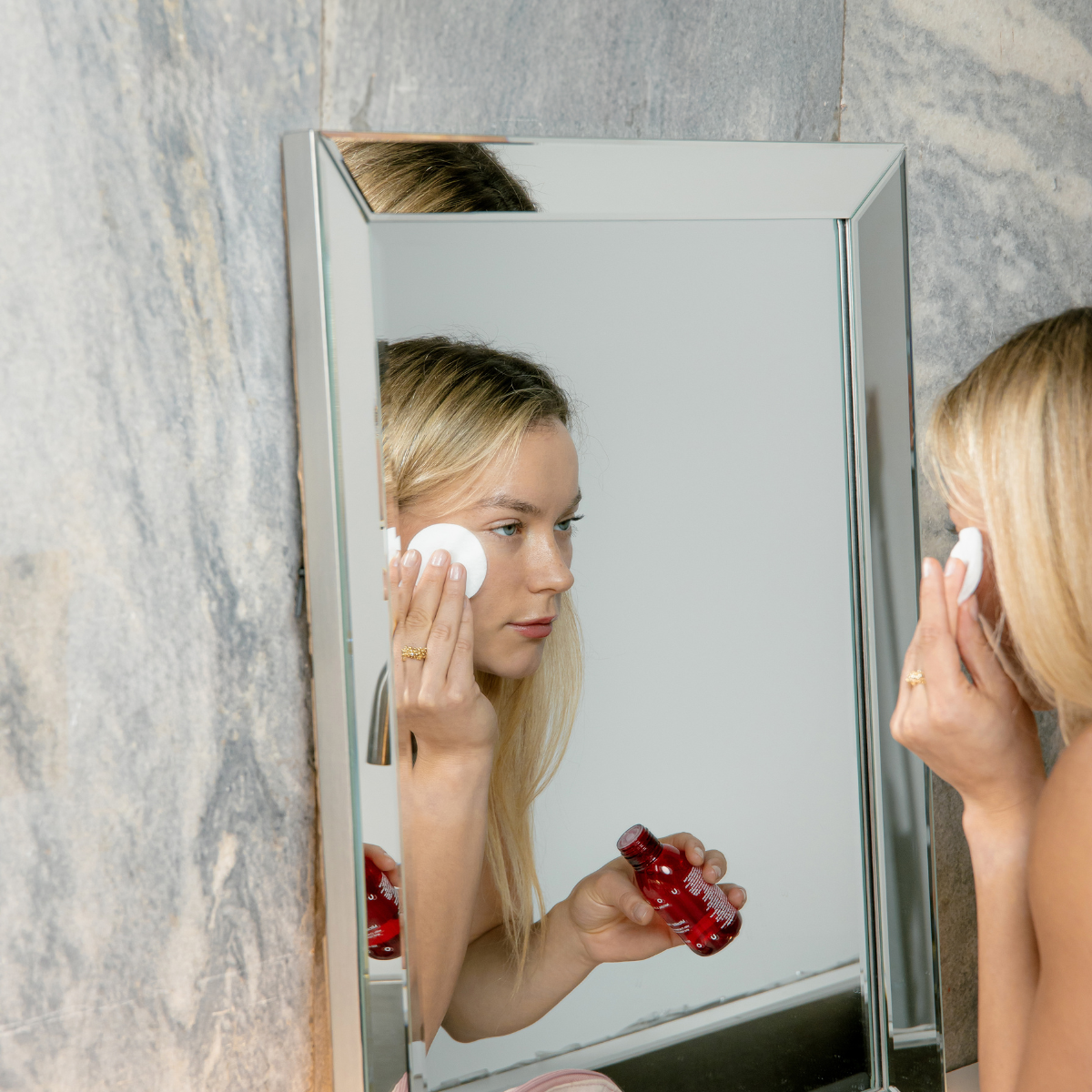 - Eine kleine Menge auf ein Wattepad auftragen und damit das Gesicht gründlich reinigen.