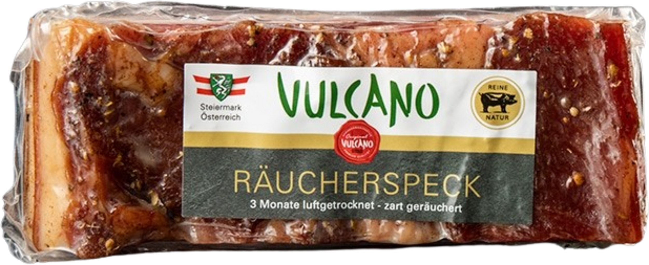 Der “Vulcano Räucherspeck” ist nicht Fett, sondern leicht durchzogen mit “weißem Fleisch”. Unvergleichlich im Geschmack.