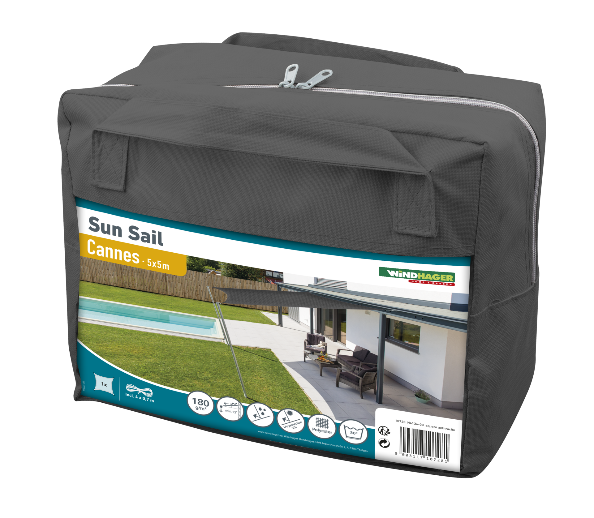 Windhager Sonnensegel SunSail CANNES Quadrat 5x5m, anthrazit