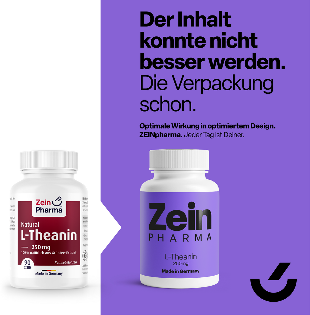 L-Theanin ist eine nicht-proteinogene Aminosäure. Die Kapseln von ZeinPharma liefern 250 mg Grüntee-Extrakt, davon 100 mg natürliches L-Theanin und 75 mg Polyphenole. Die Kapseln haben einen geringen Koffeingehalt von maximal 1,25 mg pro Kapsel.