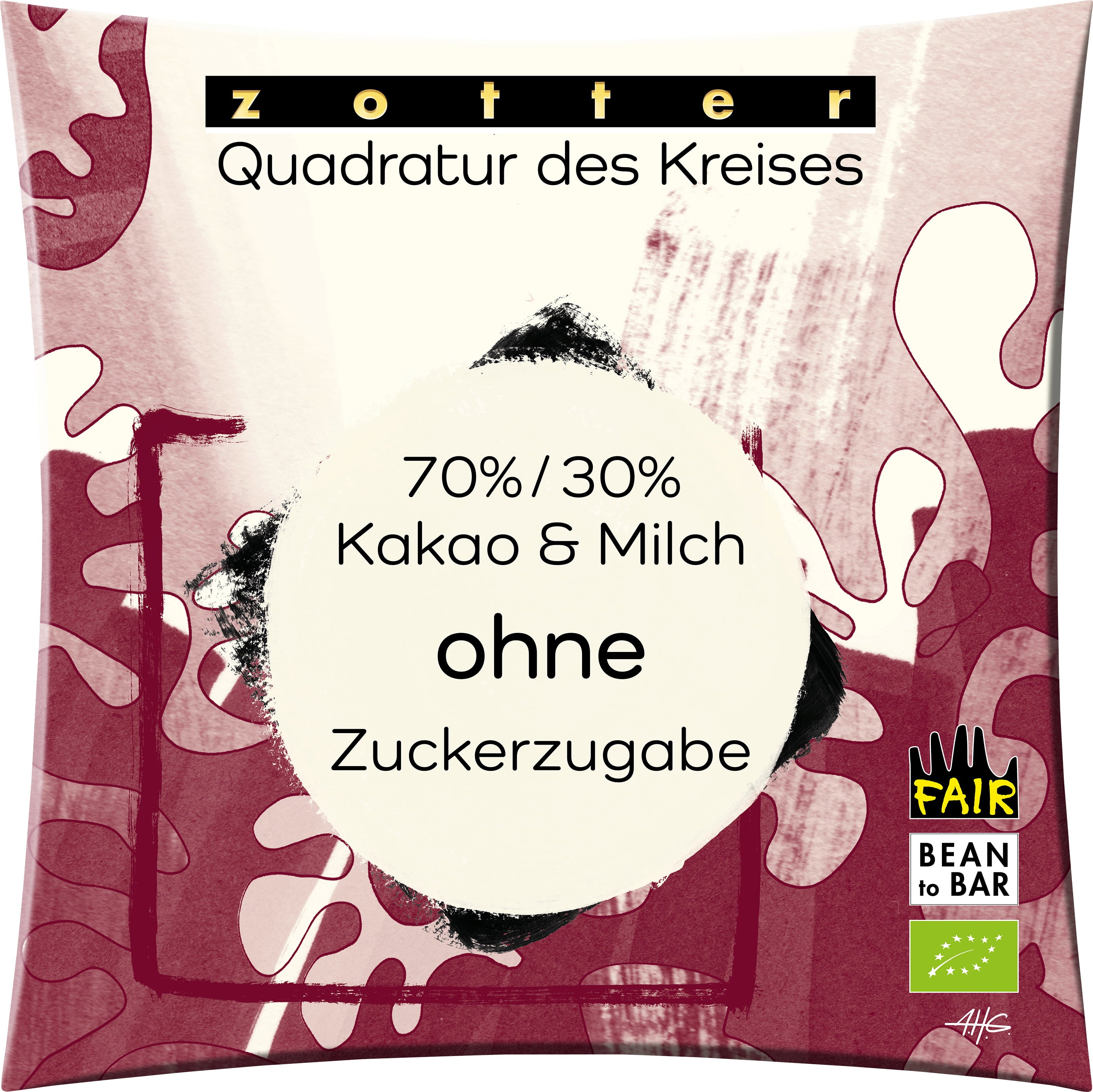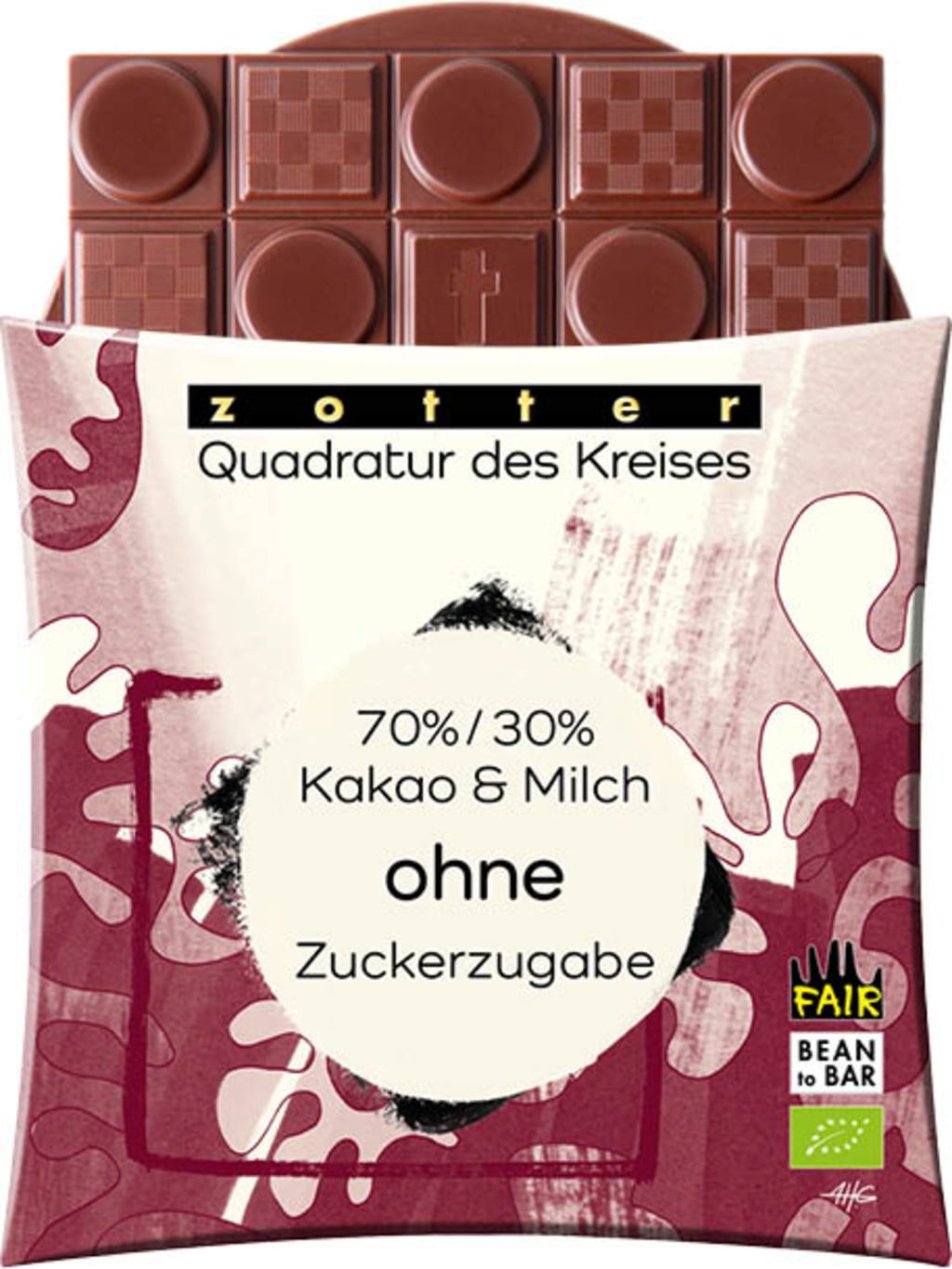Zotter Schokolade Bio Quadratur des Kreises 70%/30% Milchschoko ohne Zuckerzugabe, 70 g
