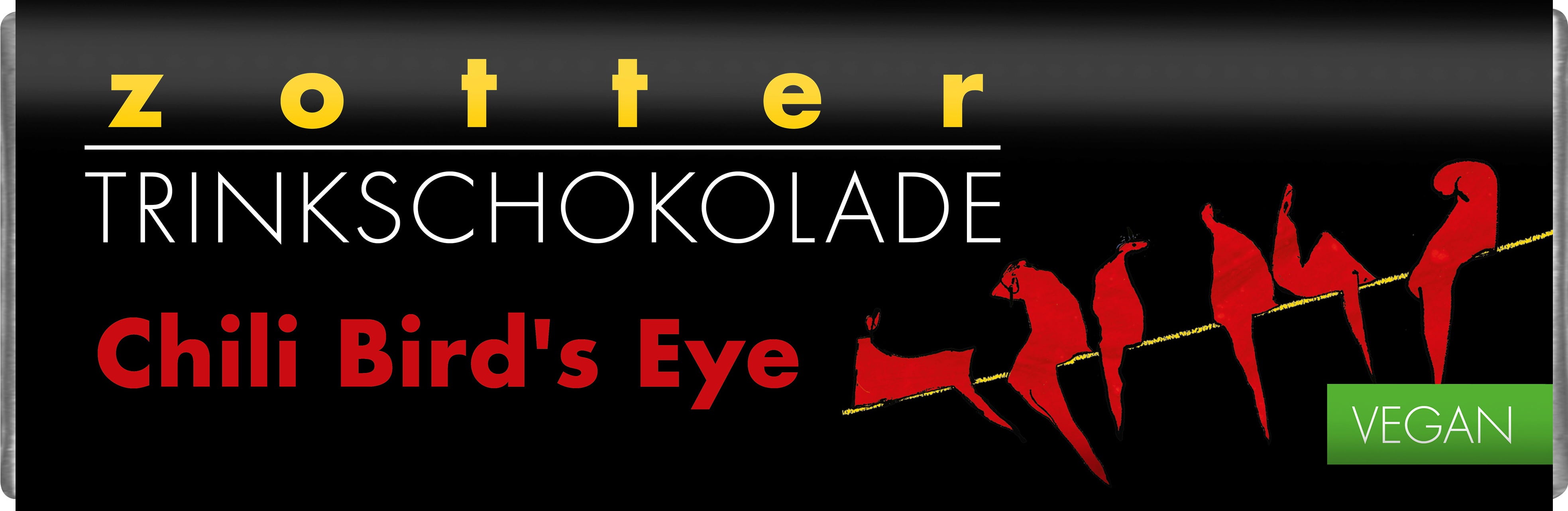 Ganz viel Chili. Chili "Bird‘s Eye" gilt als die Urform von Chili und ist selten, feurig und voller Aromen. Diese hochprozentige dunkle Trinkschokolade wird von der Bohne weg im Haus gefertigt und in Tafel gegossen. Ein scharfer Drink, der die Sinne belebt.